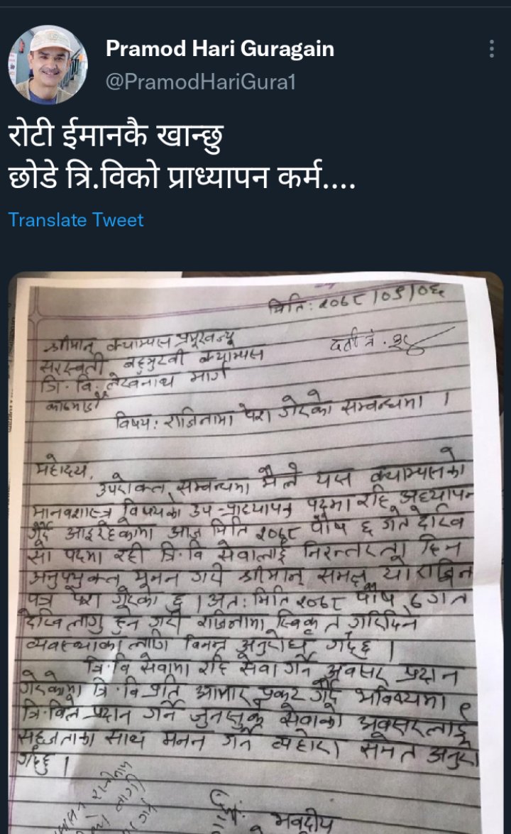 काठमाडौं । नेपाली कांग्रेसका १४ औं महाधिवेशनमा कांग्रेस केन्द्रीय सदस्यको उम्मेदवार बनेको सरस्वती बहुमुखी क्याम्पसका उपप्राध्यापक प्रमोदहरि गुरागाईंले राजीनामा दिएका छन् ।