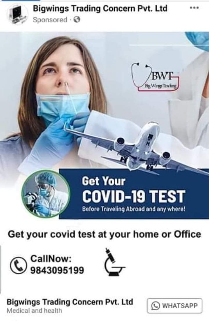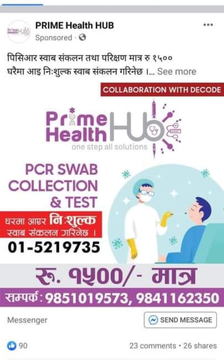अनुमति नै नलिइ यसरी जथाभावी फेसबुकमा विज्ञापन गर्दै पीसीआर परीक्षणमा जनता ठगिरहेको केन्द्ररीय प्रयोगशालाले जनाएको छ । तर, यसलाई नियमन गरी नागरिक ठगिनबाट बचाउने सोचमा कोही देखिएका छैनन् ।
