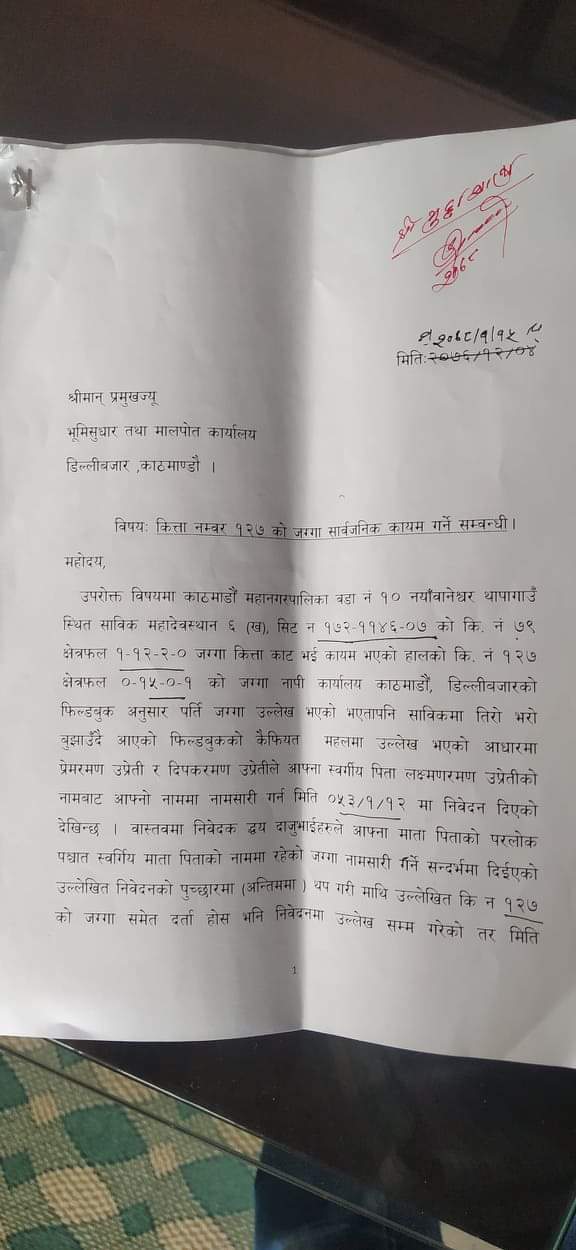 ट्याग : ## अख्तियार, ## बानेश्वर, #कवि अर्जुन पराजुली, #किर्ते', #डा. प्रेमरमण उप्रेती, #थापागाउँ, #दुषित दर्ता, #पर्ती जग्गा, #पाठशाला स्कूल, #पार्किङ, #मन्टेश्वरी, #मालपोत कार्यालय, #सार्वजनिक जग्गा हडप्ने