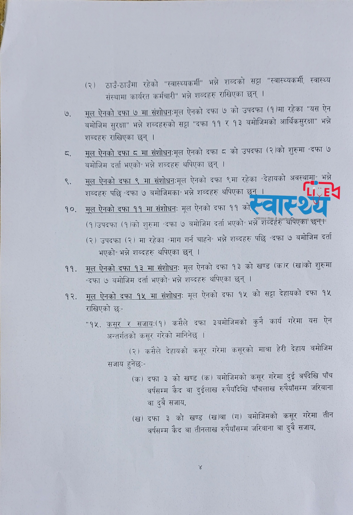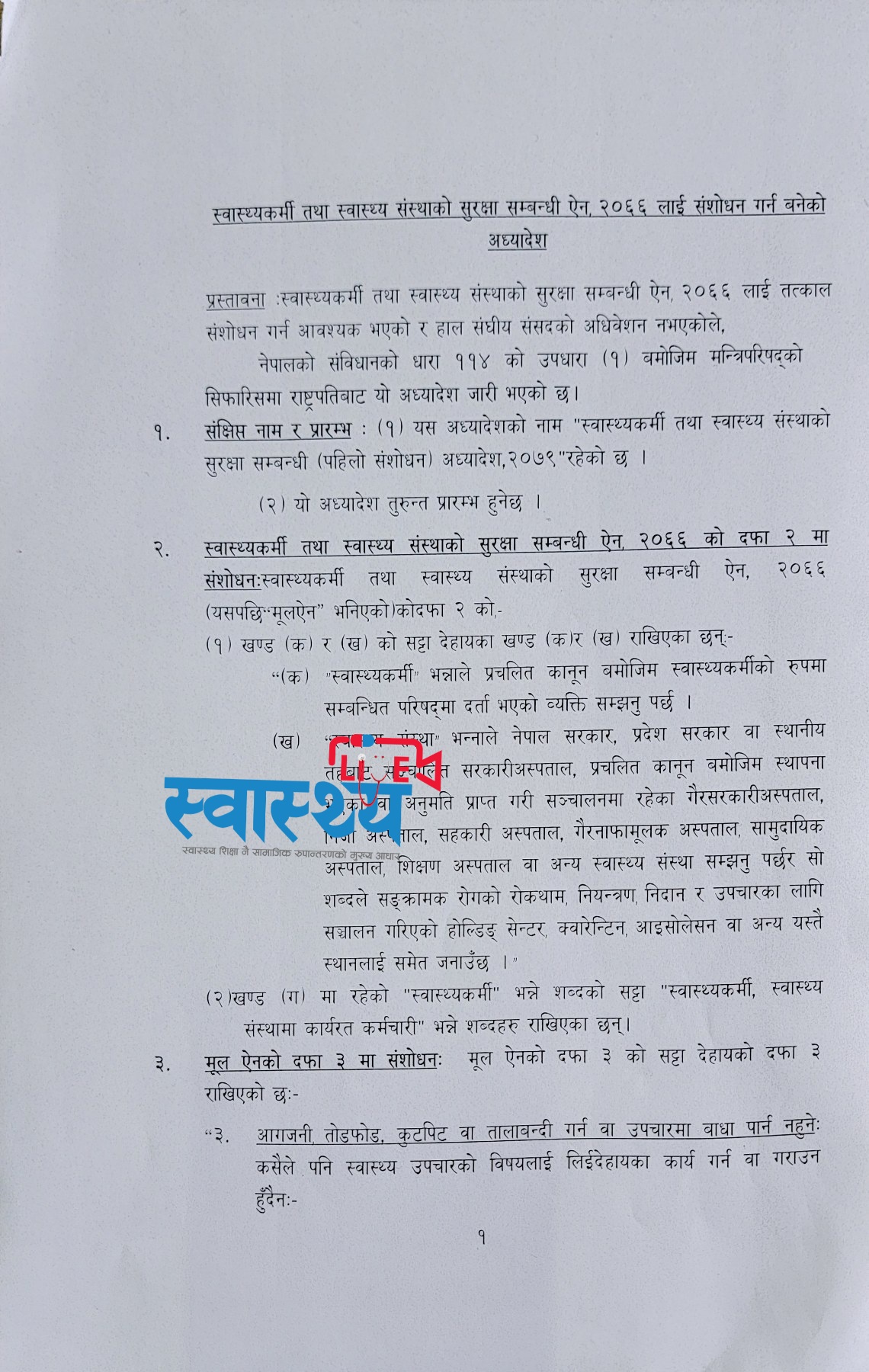 मन्त्रिपरिषद्ले स्वास्थ्यकर्मी तथा स्वास्थ्य संस्थाको सुरक्षासम्बन्धी ऐन, २०६६ (पहिलो) संशोधन अध्यादेश पारित गरेर स्वीकृतिका लागि राष्ट्रपतिसमक्ष पठाएको छ । राष्ट्रपतिबाट उक्त अध्यादेश जारी भएपछि स्वास्थ्यकर्मीमाथि हातपात गर्नेलाई बिनाधरौटी पुर्पक्षमा राख्न बाटो खुल्ने छ ।