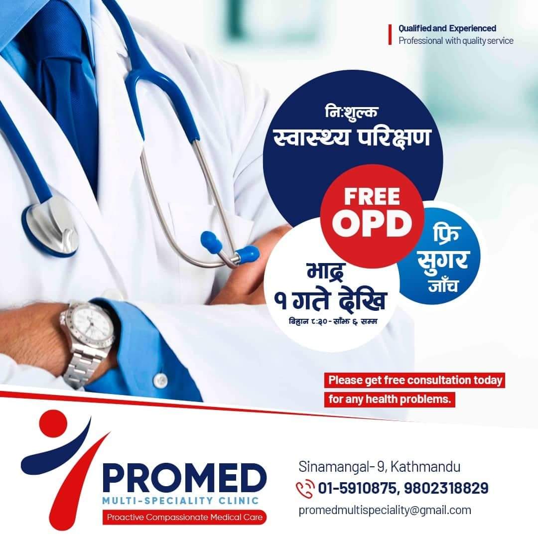 प्रोमेडले भाद्र १ देखि विशेषज्ञ चिकित्सकहरुबाट नि:शुल्क ओपीडी सेवा दिइरहेकाले गएर सेवा लिन सकिने संस्थाले जनाएको छ । प्रामेडले बिहान साढे ८ बजेदखि बेलुका ८ बजेेेेसम्म निःशुल्क ओपीडी सेवा तथा स्वास्थ्य परीक्षण गरिरहेको हो ।