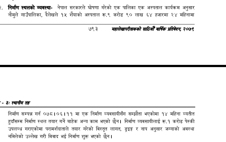 महालेखा परीक्षकको कार्यालयका अनुसार उक्त एक पालिका अस्पताल कार्यक्रम अन्तर्गत भवन बनाउन ९ करोड ९० लाखमा ठेक्का सम्झौता भएको हो । २४ महिनामा अस्पताल भवन निर्माण सम्पन्न हुनुपर्नेमा ६ महिना बाँकी रहँदा पनि जग खन्ने काम भएको छैन ।