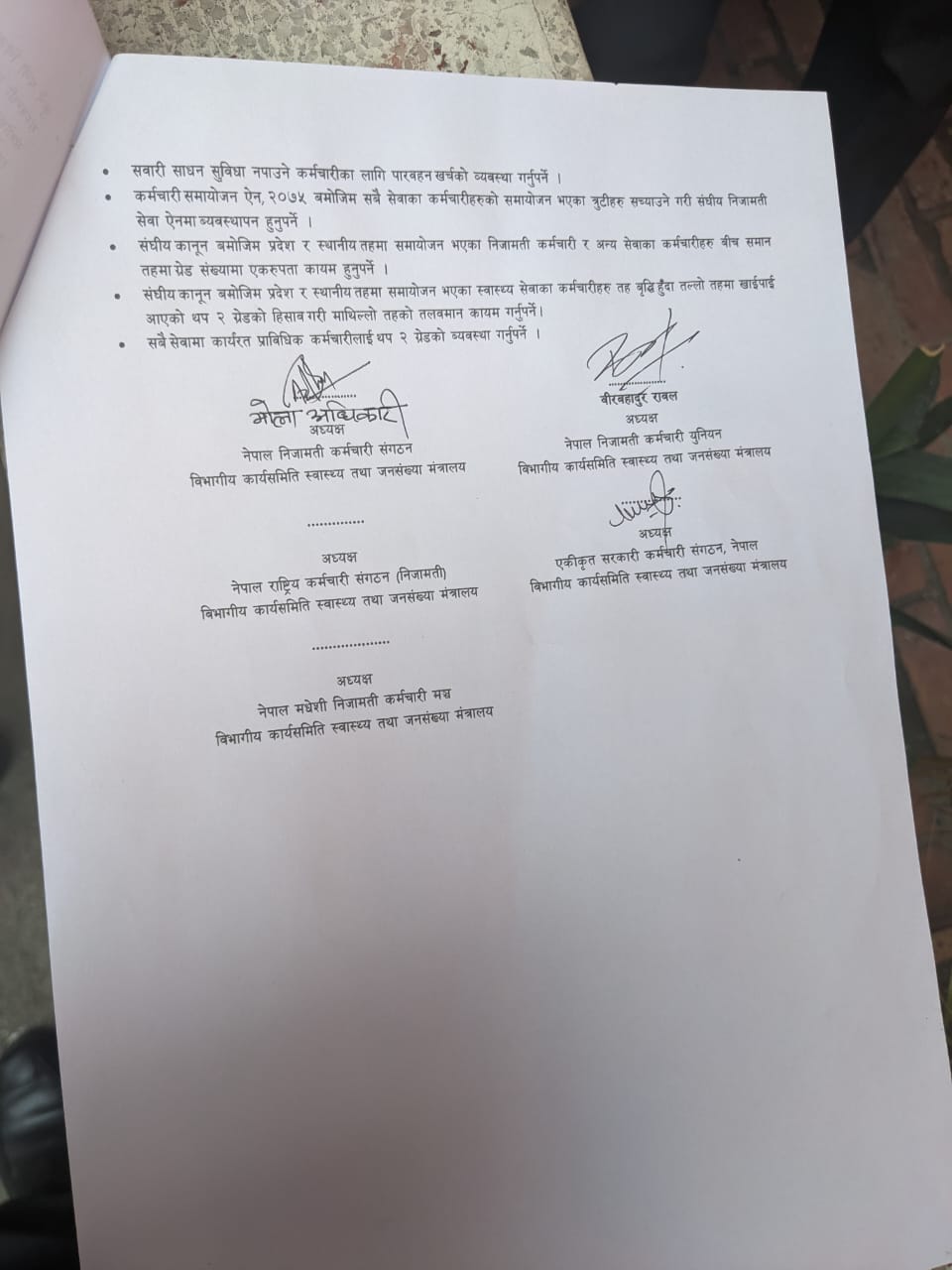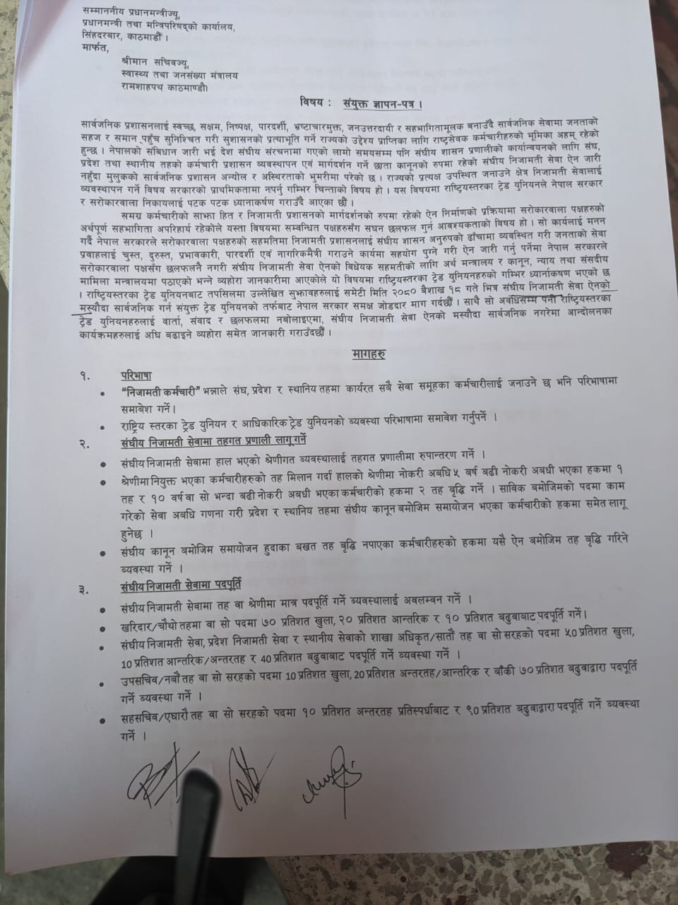 स्वास्थ्य तथा जनसङ्ख्या मन्त्रालयका सचिवमार्फत् बुधवार स्वास्थ्य तर्फका ठूला पाँच कर्मचारी ट्रेड युनियनले प्रधानमन्त्रीलाई संयुक्त रुपमा ज्ञापन पत्र बुझाइएका हुन् ।