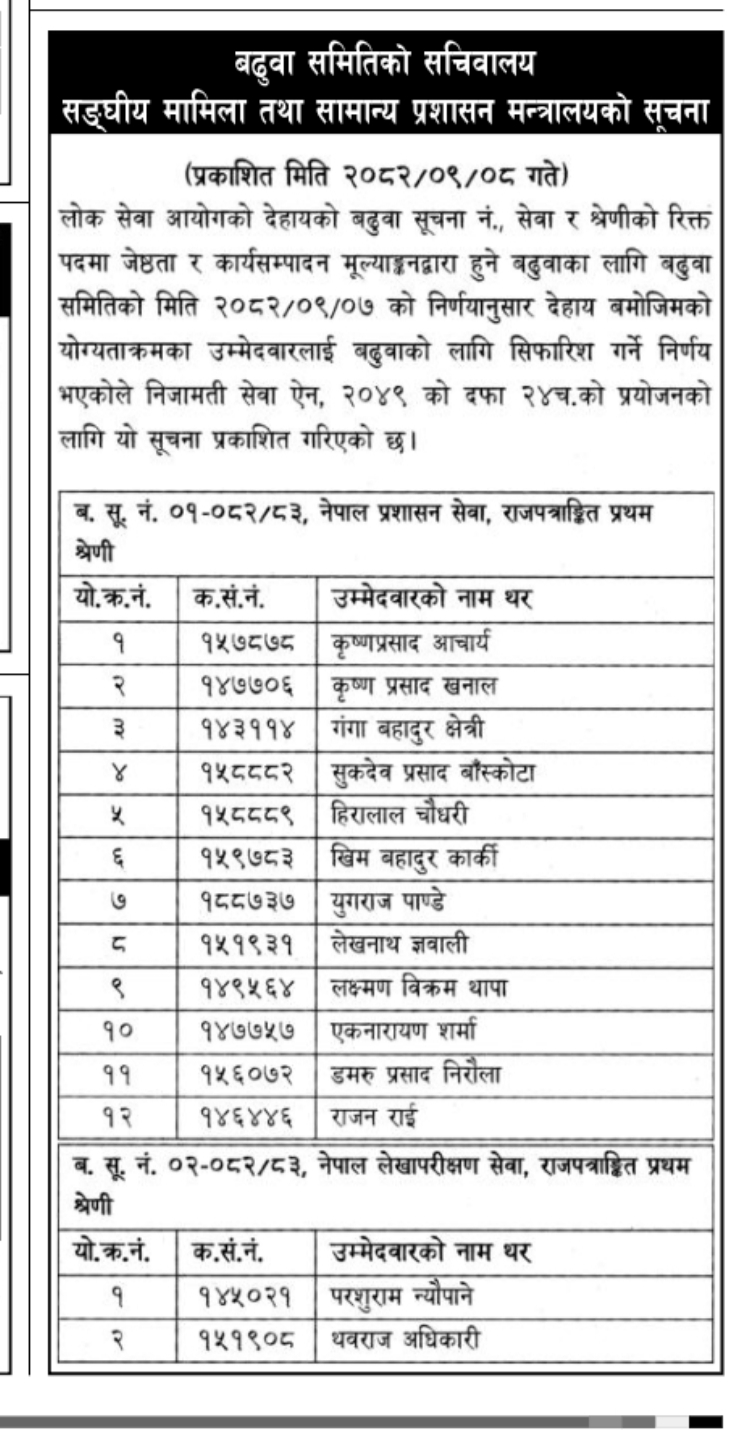 संघीय मामिला तथा सामान्य प्रशासन मन्त्रालय अन्तर्गत रहेको बढुवा समितिले निकालेको सूचना अनुसार नेपाल प्रशासन सेवामा १२ जना र लेखापरीक्षण सेवाका २ उपसचिव सहसचिवमा बढुवाका लागि सिफारिस भएका छन्। प्रशासन सेवामा कृष्णप्रसाद आचार्य, कृष्णप्रसाद खनाल, गंगाबहादुर क्षेत्री, सुकदेवप्रसाद बाँस्कोटा, हिरालाल चौधरी, खिमबहादुर कार्की, युगराज पाण्डे, लेखनाथ ज्ञवाली, लक्ष्मण विक्रम थापा, एकनारायण शर्मा, डमरूप्रसाद निरौला र राजन राई सहसचिवमा बढुवाका लागि सिफारिस भएका हुन्। कार्की र पाण्डे राजस्व समूहका हुन्। बाँस्कोटा लेखा समूहका र बाँकी सामान्य प्रशासन समूहका उपसचिव हुन्। ५८ वर्षे उमेर हदका कारण थापा सहसचिवमा उक्लिएर घर जानेछन्।
