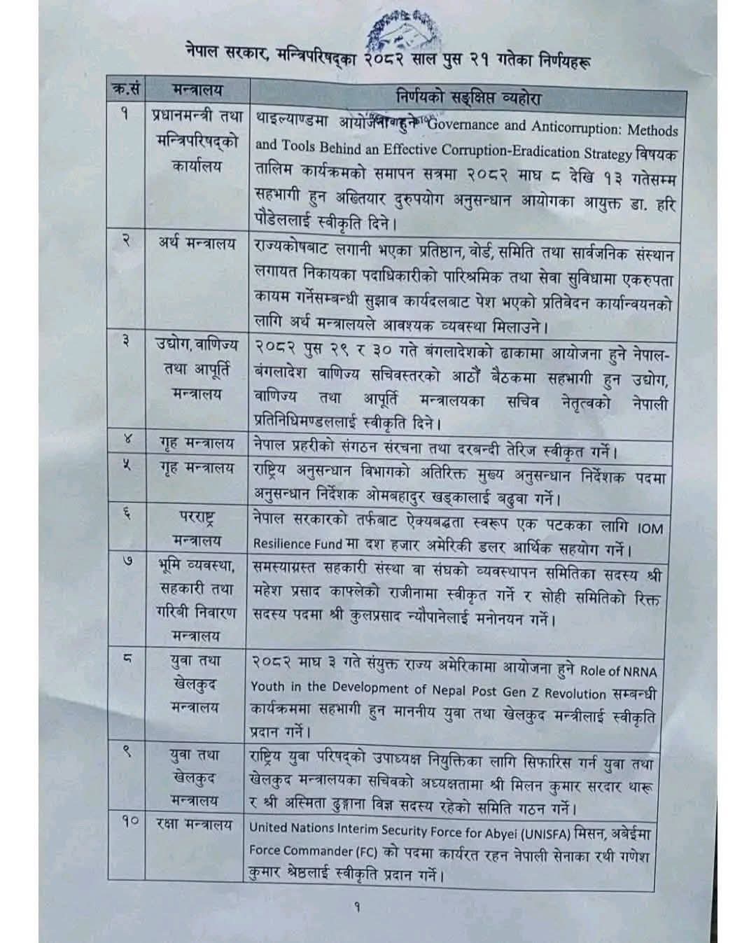२०८२ माघ ३ गते संयुक्त राज्य अमेरिकामा आयोजना हुने ‘जे-जी’ क्रान्तिपछिको नेपालको विकासमा एनआरएनए युवाको भूमिका’सम्बन्धी कार्यक्रममा सहभागी हुन खेलकुदमन्त्री गुप्तालाई स्वीकृति प्रदान गर्ने मन्त्रिपरिषद्ले निर्णय गरिसकेको छ। उनी अमेरिका उड्ने तयारीमा छन्।