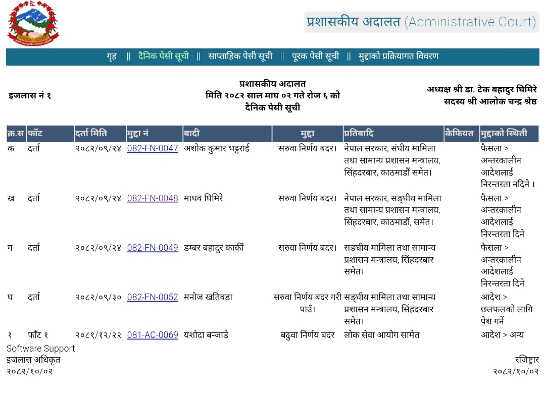 सरूवा निर्णय बदर गर्न माग गर्दै प्रशासकीय अदालतमा परेको मुद्दामा अध्यक्ष डा. टेकबहादुर घिमिरे र सदस्य आलोकचन्द्र श्रेष्ठको इजलासले भट्टराईको हकमा अन्तरकालीन आदेशलाई निरन्तरता नदिने आदेश गरेर सरूवा निर्णय कार्यान्वयन गर्न सहज गरिदिएको छ। जिल्ला समन्वय समिति, भोजपुरमा सरुवा भएका भट्टराई रमाना लिएर हिँडेकाले उनको सरूवा कार्यान्यवन गर्न अदालतले अवरोध नगरेको हो। जिल्ला समन्वय समिति, संखुवासभामा सरूवा भएका घिमिरे भने उता नगई मालपोतमै बस्न जोडबल गरेकाले उनको सरूवा कार्यान्वयन नगर्न अदालतले आदेश दिएको हो। भूमि व्यवस्था, सहकारी तथा गरिबी निवारण मन्त्रालयले उनलाई कुनै पनि मालपोतमा पठाउन सक्छ।