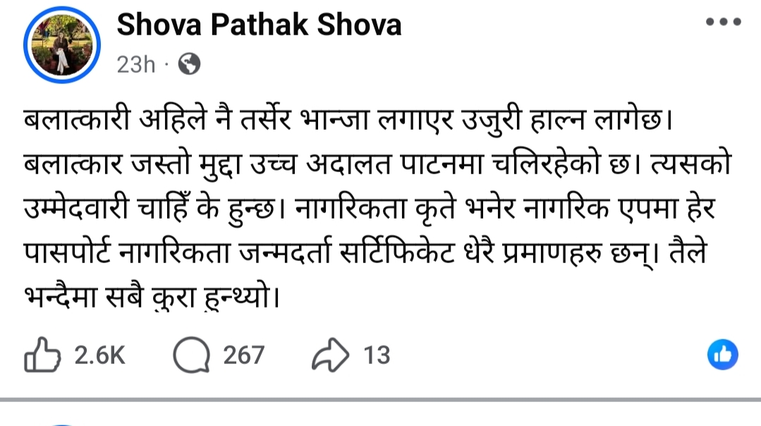 नेपाल जनसेवा पार्टीका उम्मेदवार पाठक आफूविरुद्ध बस्नेतले भान्जा लगाएर उजुरी हाल्न लगाएको आरोप लगाइएकी छिन्। रास्वपाको खत्रीविरुद्ध बेतुकको उजुरी हाल्न लगाएर करोडौंको प्रचार गरिदिएका छन्। उक्त उजुरीले उल्टै खत्रीलाई फाइदा भएको देखिन्छ।