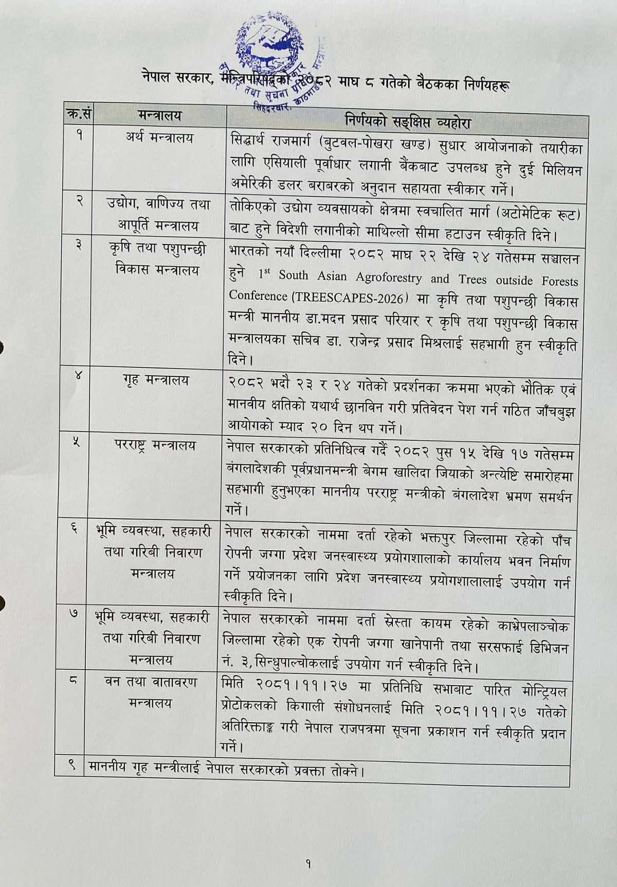 यस्ता छन् मन्त्रिपरिषद्का ८ निर्णय
