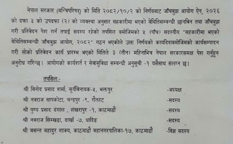 जाँचबुझ आयोगको अध्यक्षमा भक्तपुरका विनोदप्रसाद शर्मा रहेका छन्। सदस्यमा रौतहटका नवराज सापकोटा, धादिङका नवराज सिम्खडा काठमाडौंका पुण्यप्रसाद दंगाल रहेका छन्। विज्ञ सदस्यका रूपमा काममाडौं महानगरपालिका वडा नम्बर-१७ का वसन्तबहादुर शाक्य रहेका हुन्। सापकोटा नेपाल सरकारका अवकाशप्राप्त सहसचिव हुन् । सिम्खडा सहकारी वा बैंक तथा वित्तीय संस्थाको क्षेत्रमा अनुभवी र दंगाल सहकारी कानुनको क्षेत्रमा पैरबी गर्दै आएका कानुन व्यवसायी हुन्। शाक्य सहकारी वा बैंक तथा वित्तीय संस्थाको क्षेत्रमा अनुभवी व्यक्ति रहेका छन्। आयोगले तीन महिनाभित्र प्रतिवेदन पेस गर्नुपर्ने व्यवस्था रहेकाले त्यसपछि धेरै कर्मचारीको भागाभाग हुने स्थिति देखिन्छ।