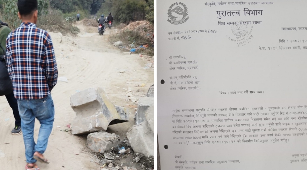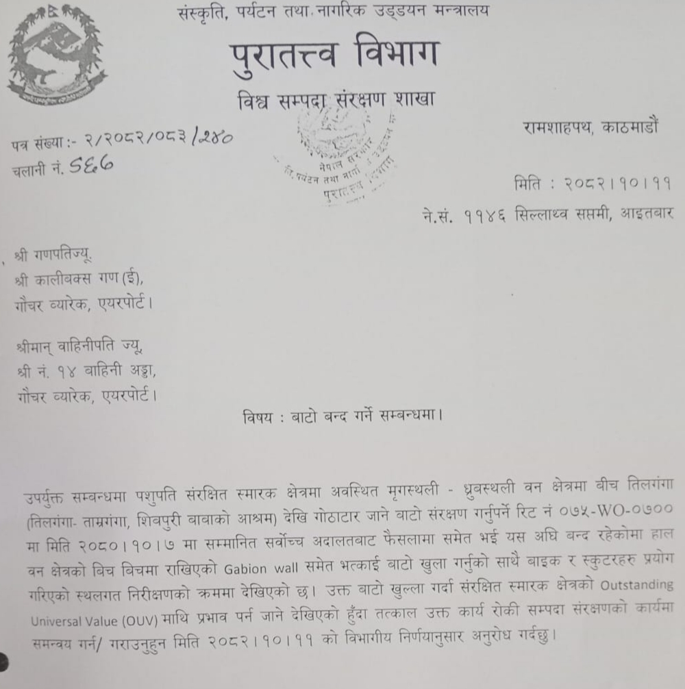 कोषले तिलगंगा-गुहेश्वरी बाटो खुलायो, पुरातत्त्व विभागले बाटो बन्द गर्न सेनालाई पत्र काट्यो