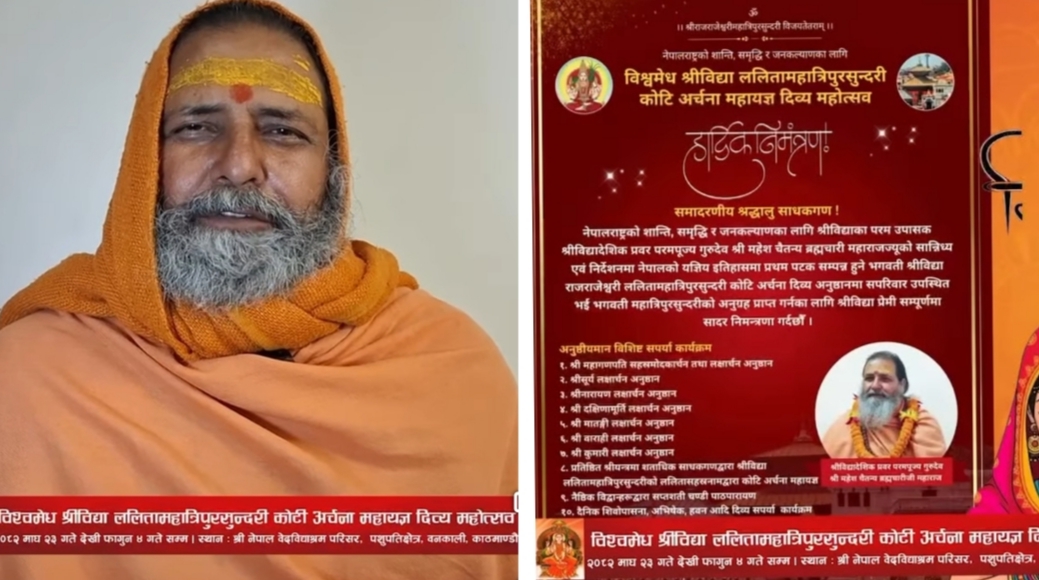 नेपाल राष्ट्रको शान्ति, समृद्धि र जनकल्याणका लागि श्रीविद्याका परम उपासक श्रीविद्यादेशिक प्रवर परमपूज्य गुरूदेव श्री महेश चैतन्य ब्रह्मचारीजी महाराजज्यूको सान्निध्य एवं निर्देशनमा नेपालको यज्ञिय इतिहासमा पहिलोपटक सम्पन्न हुने भगवती श्रीविद्या राजराजेश्वरी ललितामहात्रिपुरसुन्दरी कोटी अर्चना दिव्य अनुष्ठान सुरू भएको हो। ११ दिनसम्म चल्ने उक्त महायज्ञ नेपालमै पहिलोपटक हुन गइरहेको आयोजन संस्थाले जनाएको छ।