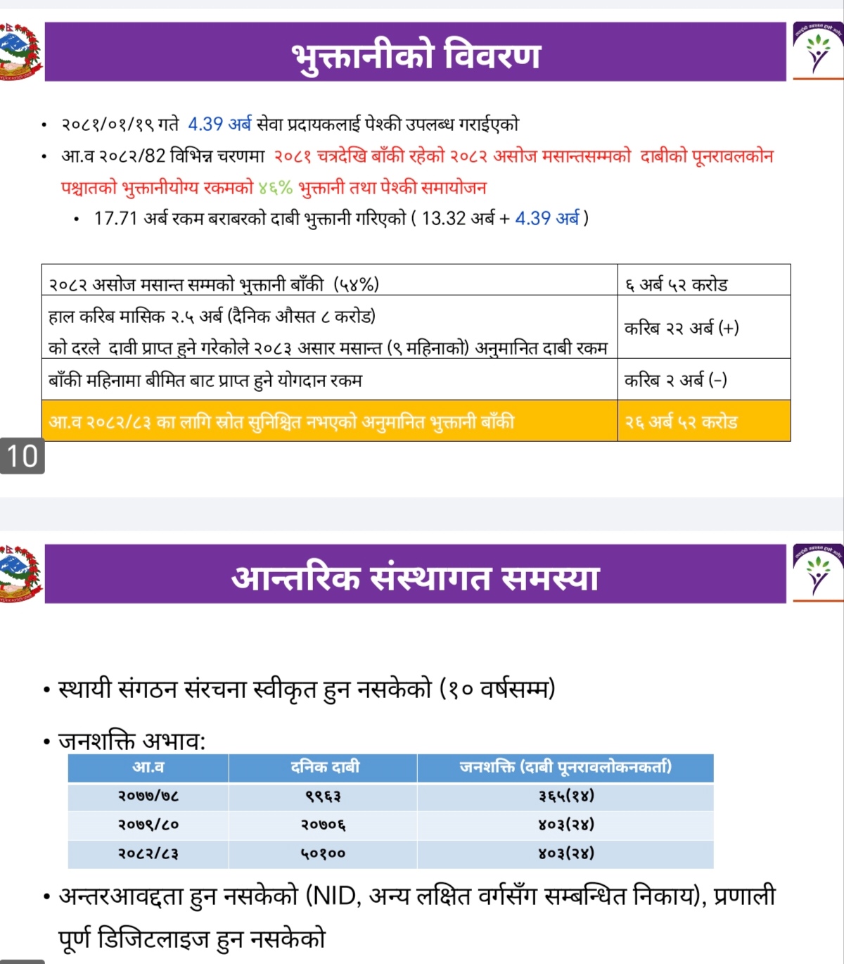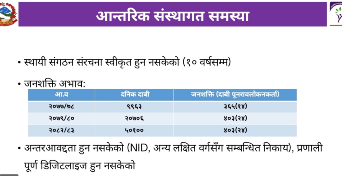 आर्थिक वर्ष २०७९/o८० दैनिक २०,७०६ दाबी छ । जनशक्तिकाे संख्या ४०३ रहेको छ । यसलाई आधार मान्दा प्रति कर्मचारी २४ दाबी पुनरावलोकन कर्ता छन् । त्यस्तै आर्थिक वर्ष २०८२/o८३ मा दैनिक ५०,१०० दाबी छ । जनशक्ति ४०३ मात्रै छन् । यसमा पनि प्रति कर्मचारी २४ दाबी पुनरावलोकन कर्ता छन् ।