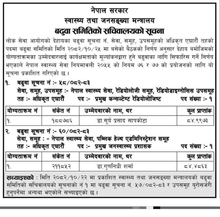 डा. सापकाेटा नेपाल स्वास्थ्य सेवा, रेडियोलोजी समूह, रेडियोडाइग्नोसिस उपसमूहको एघारौं तहमा बढुवाका लागि सिफारिस भएका छन्। त्यस्तै डा. शर्मा नेपाल स्वास्थ्य सेवा, पब्लिक हेल्थ एडमिनिस्ट्रेशन समूहको एघारौं तहमा बढुवाका लागि सिफारिस भएका हुन्। कार्यक्षमताको मूल्यांकनद्वारा उनीहरू बढुवा सिफारिस भएका हुन्।