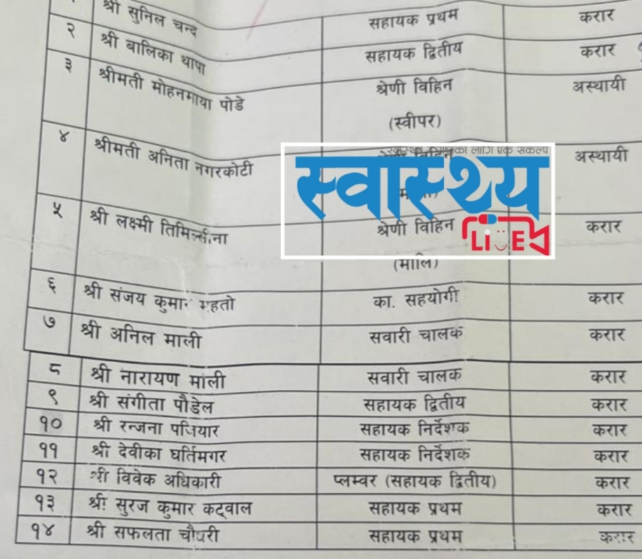 त्यस्तै खरिदार सरहका बालिका थापा, संगीता पौडेल र विवेक अधिकारीलाई सेवाबाट हटाइएको छ। सवारी चालक अनिल माली र नारायण माली, माली अनिता नगरकोटी र लक्ष्मी तिमिल्सिना, स्वीपर मोहनमाया पोडे तथा कार्यालय सहयोगी संजय कुमार महतोलाई समेत पदबाट हटाइएको हो।