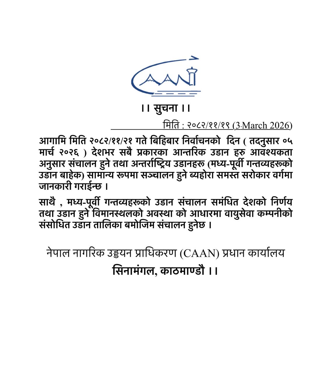 मध्य-पूर्वी गन्तव्यहरूको उडानबाहेक अन्तर्राष्ट्रिय उडानहरू सामान्य रूपमा सञ्चालन हुने प्राधिकरणले जनाएको छ। निर्वाचनका दिन मतदातालाई आन्तरिक विमानस्थल प्रयोग गरेर मतदानस्थलमा पुग्न मिल्ने गरी प्राधिकरणले व्यवस्था मिलाएको हो।