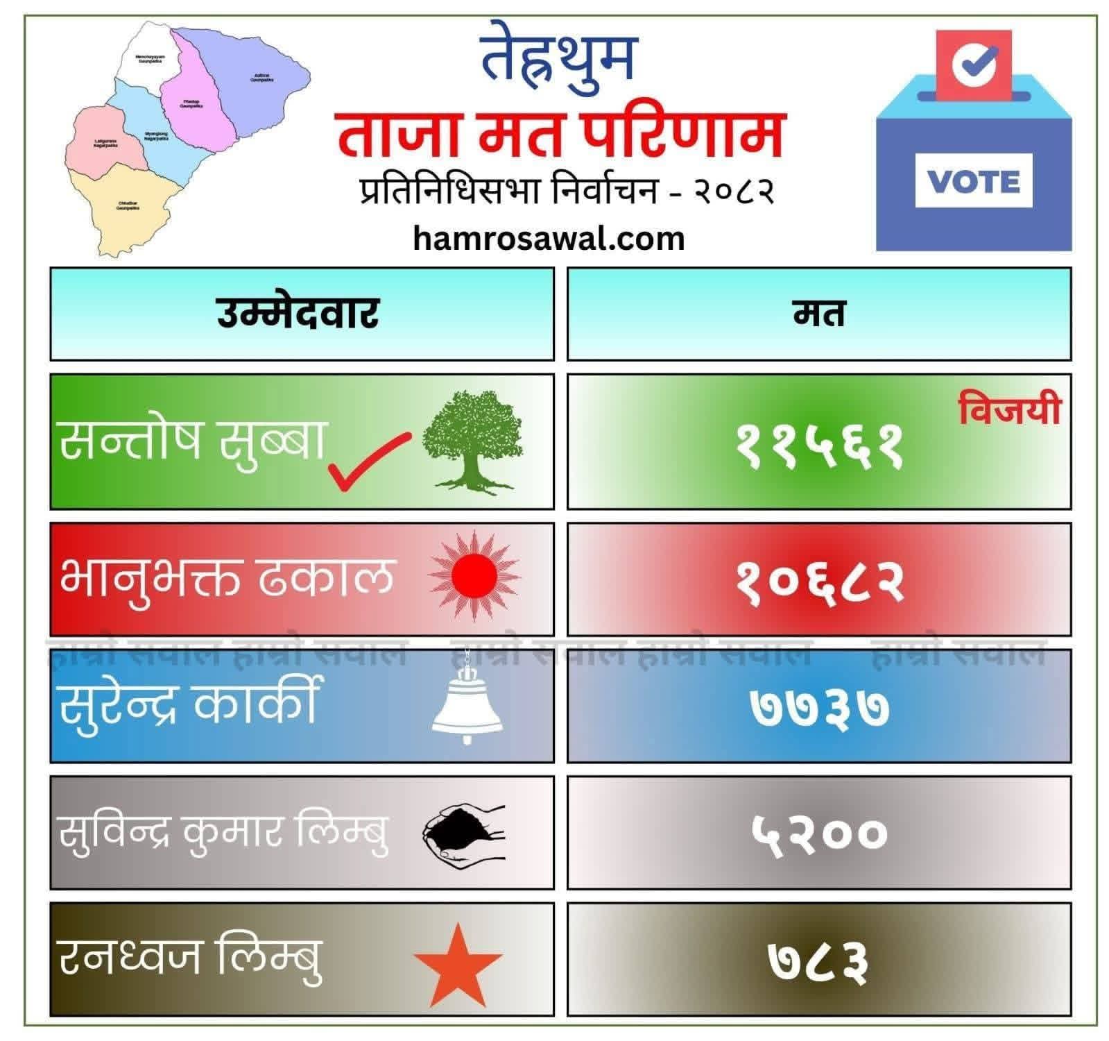 कांग्रेसका सुब्बा र एमालेका उम्मेदवार पूर्व स्वास्थ्यमन्त्री ढकालबीच ८७९ को मतान्तर रहेको छ। अघिल्लोपटकको निर्वाचनमा मोरङ ३ बाट सुनिल कुमार शर्मासँग हारेर यसपटक तेह्रथुम उक्लिएका ढकालले नराम्रोसँग हार चाखेका छन्। सुशासन कायम गर्ने र भ्रष्टाचारविरुद्ध कडा कदम चाल्ने बालेन नेतृत्वको सरकारले ओम्नी काण्डको फाइल खोल्ने निश्चित छ। त्यसको प्रतिवाद गर्न ढकाल संसद्मा छिर्न नपाउने भएका छन्। ओम्नी काण्डको छानबिन दायरमा आउने निश्चित भएका ढकाललाई तेह्रथुमे मतदाताले दण्डित गरेका हुन्।