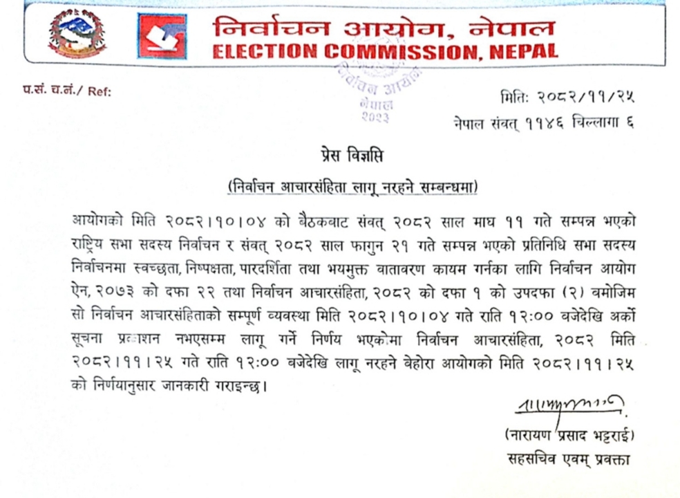 निर्वाचन आचारसंहिताको सम्पूर्ण व्यवस्था मिति २०८२/१०/०४ गते राति १२ बजेदेखि अर्को सूचना प्रकाशन नभएसम्म लागू गर्ने निर्णय भएकोमा निर्वाचन आचारसंहिता, २०८२ मिति २०८२/११/२५ गते राति १२ बजेदेखि लागू नरहने,’ विज्ञप्तिमार्फत् आयोगले जनाएकाे छ। निर्वाचन आचारसंहिताका कारण रोकिएका काम अघि बढाउन मिल्ने भएको हो। अब निर्वाचन आयोगसँग कुनै काम गर्न सहमति लिनु नपर्ने भएको हो।