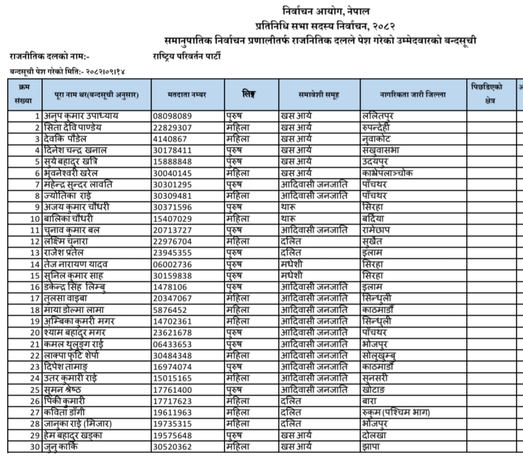 समानुपातिकमा राष्ट्रिय स्वतन्त्र पार्टी ५० लाख भोट कटाउने कसरतमा छ। नेपाली कांग्रेस नेपाली कांग्रेस १७ लाख, नेकपा एमाले १५ लाख, नेपाली कम्युनिस्ट पार्टी ८ लाख, श्रम संस्कृति पार्टी ४ लाख र राष्ट्रिय प्रजातन्त्र पार्टी साढे ३ लाख मत पुऱ्याउने कसरतमा छन्। जनता समाजवादी पार्टी, नेपाल र राष्ट्रिय परिवर्तन पार्टी २ लाख मत पुऱ्याउन लागिपरेका छन्। तर, उक्त सम्भावना न्यून छ।