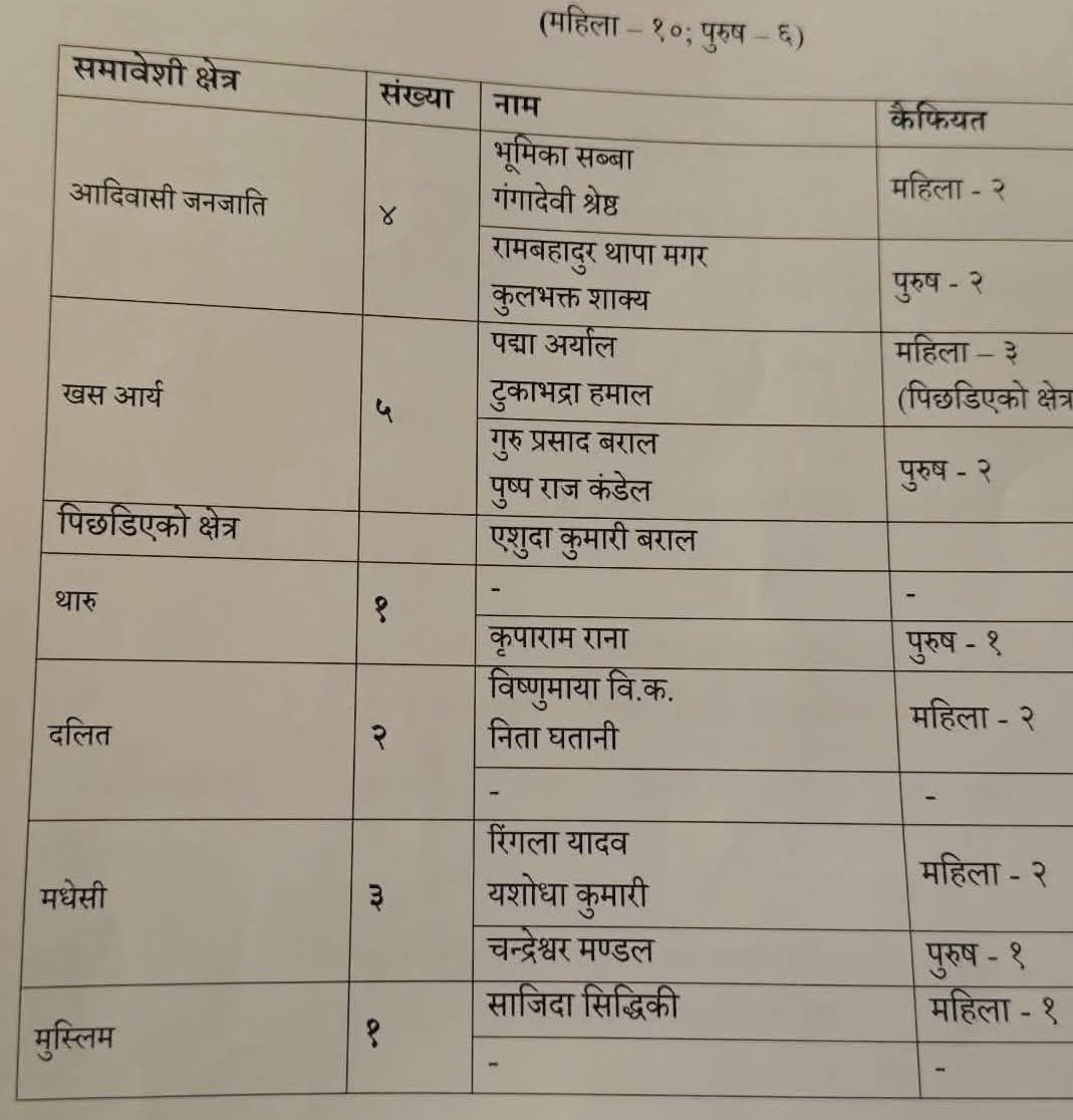 थारुबाट कृपाराम राना र दलितबाट विष्णुमाया वी.के. र नीता घटानी समानुपातिक सांसद बन्ने भएका हुन्। मधेशी महिलाबाट रिङ्ला यादव र यशोधा कुमारी यादव तथा पुरुषबाट चन्द्रेश्वर मण्डल समानुपातिक सांसद बन्ने भएका छन्। एमालेले मुस्लिमबाट साजिदा सिद्दीकीलाई समानुपातिक सांसद बनाएको हो। निर्वाचन आयोगले उक्त सूचीबाट मिलाएर समानुपातिकको नजिता सार्वजनिक गर्नेछ।