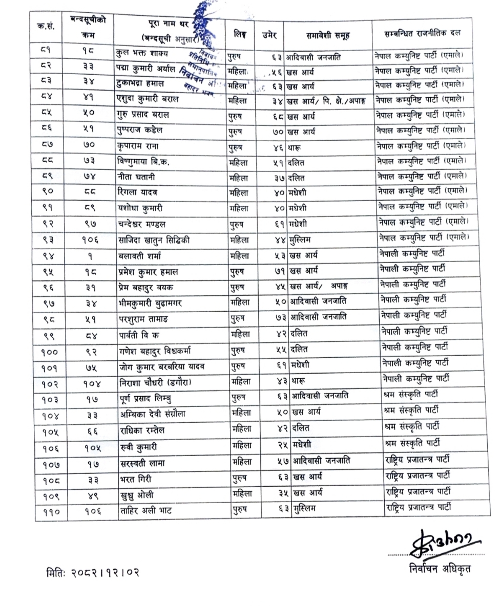 आयोगले राष्ट्रिय स्वतन्त्र पार्टीबाट ५७, नेपाली कांग्रेसबाट २०, नेकपा एमालेबाट १६, नेकपाबाट ९, श्रम संस्कृति पार्टीबाट ४ र राष्ट्रिय प्रजातन्त्र पार्टीबाट ४ जना समानुपातिक निर्वाचन प्रणालीतर्फ निर्वाचित भएको घोषणा गरेको हो।