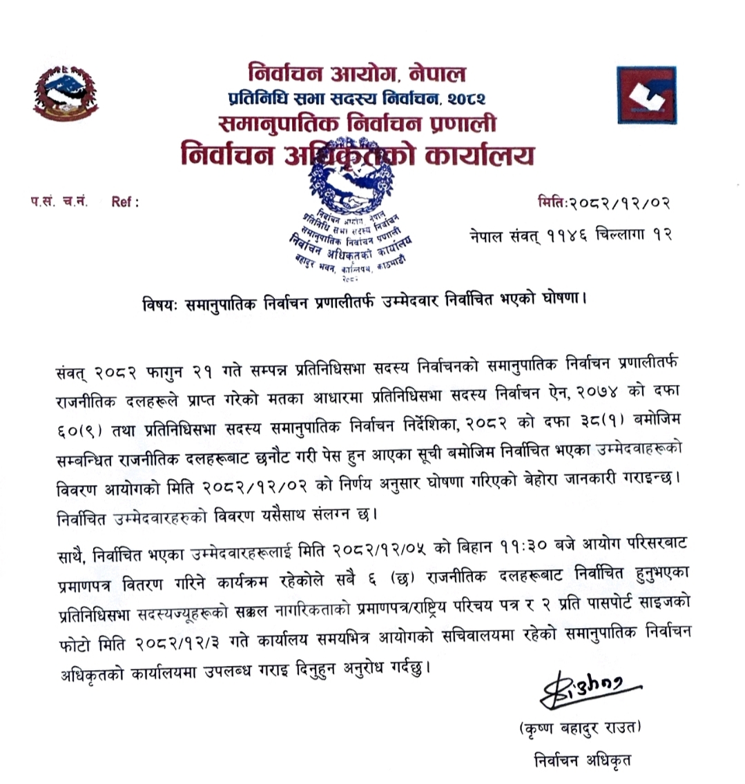 काठमाडौं। निर्वाचन आयोगले समानुपातिक निर्वाचन प्रणालीतर्फ उम्मेदवार निर्वाचित भएको घोषणा गरेको छ। निर्वाचन अधिकृत कृष्णबहादुर राउतले ११० जना समानुपातिक सांसद निर्वाचित भएको घोषणा गरेका हुन्। समानुपातिकमा डा. राम लामादेखि ताहिर अली भाटसम्म निर्वाचित भएको घोषणा गरेको हो। समानुपातिक सबैभन्दा जेष्ठ सांसद ७८ वर्षीय अर्जुननरसिंह केसी रहेका छन्।