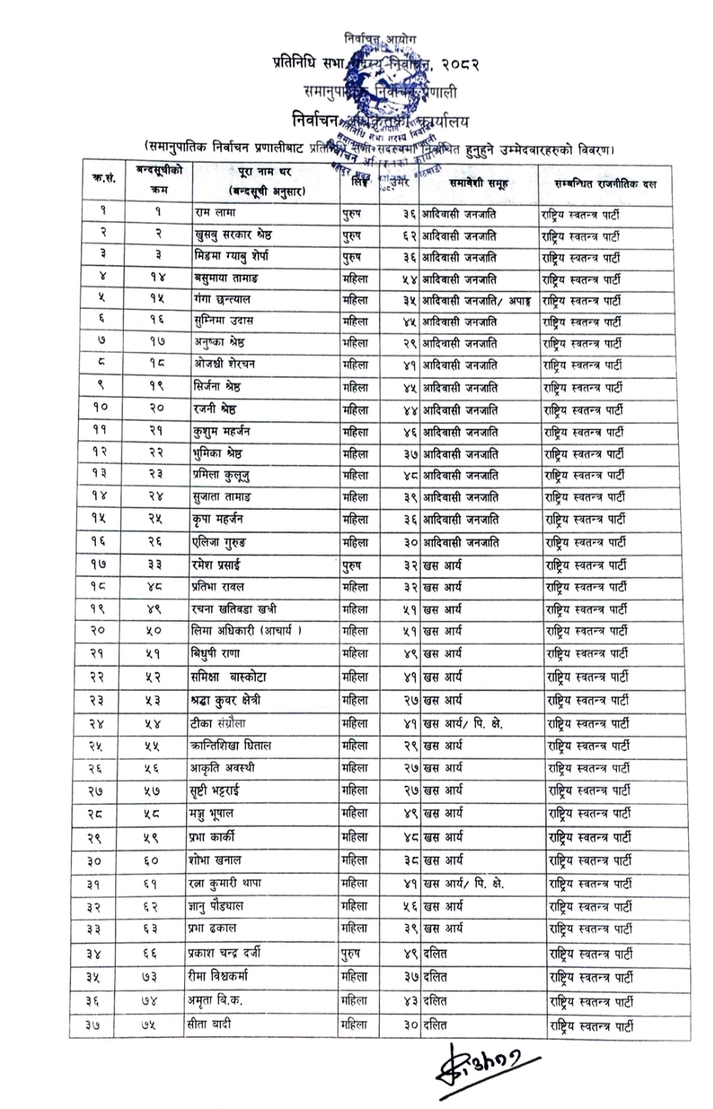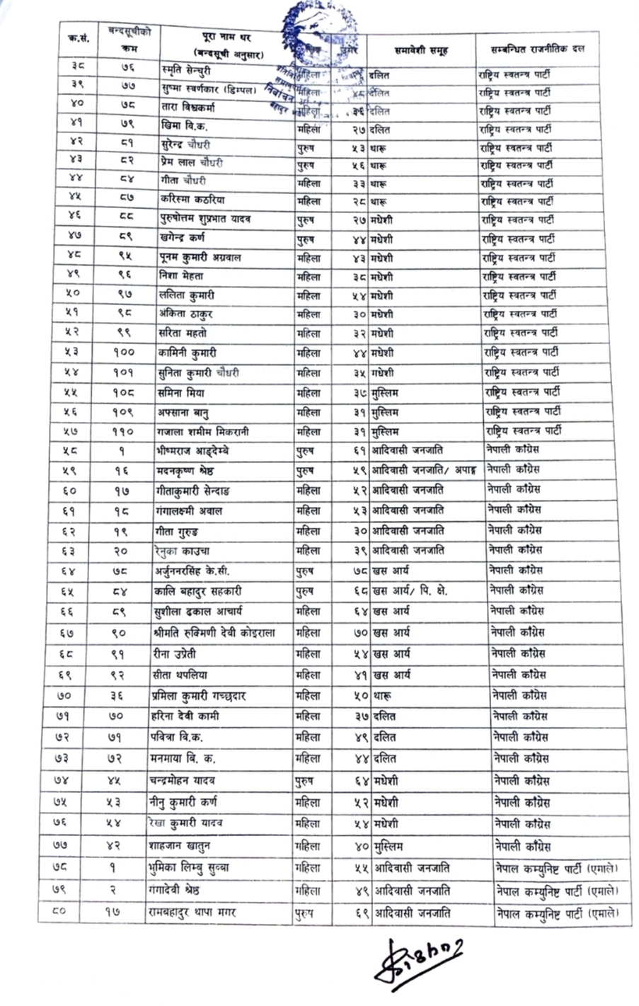 आयोगले राष्ट्रिय स्वतन्त्र पार्टीबाट ५७, नेपाली कांग्रेसबाट २०, नेकपा एमालेबाट १६, नेकपाबाट ९, श्रम संस्कृति पार्टीबाट ४ र राष्ट्रिय प्रजातन्त्र पार्टीबाट ४ जना समानुपातिक निर्वाचन प्रणालीतर्फ निर्वाचित भएको घोषणा गरेको हो।