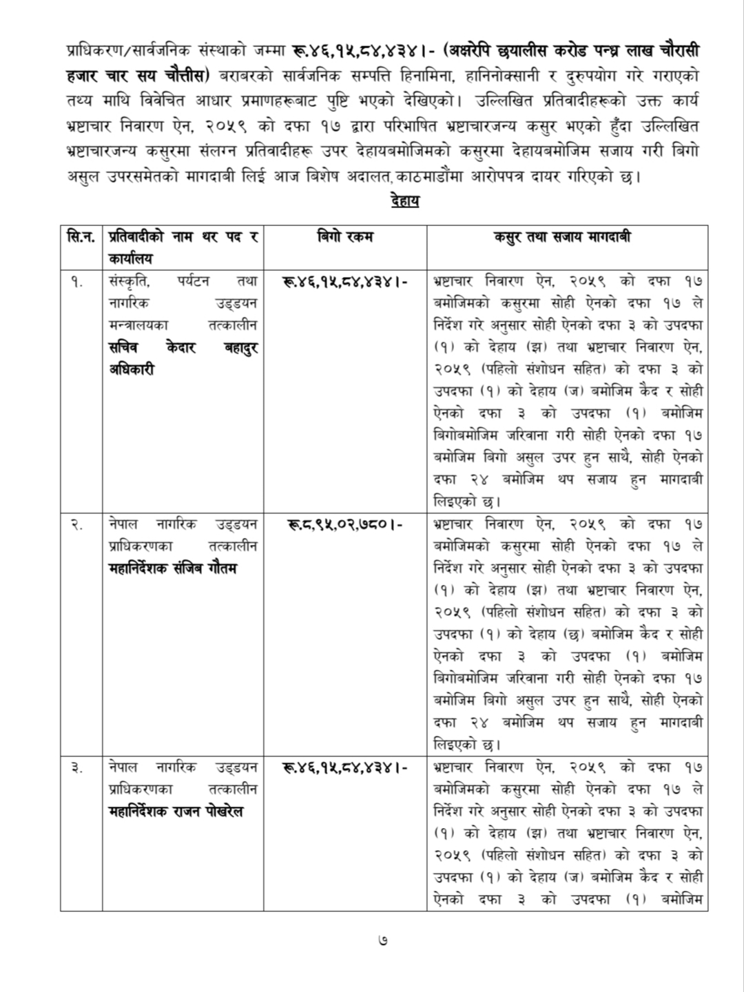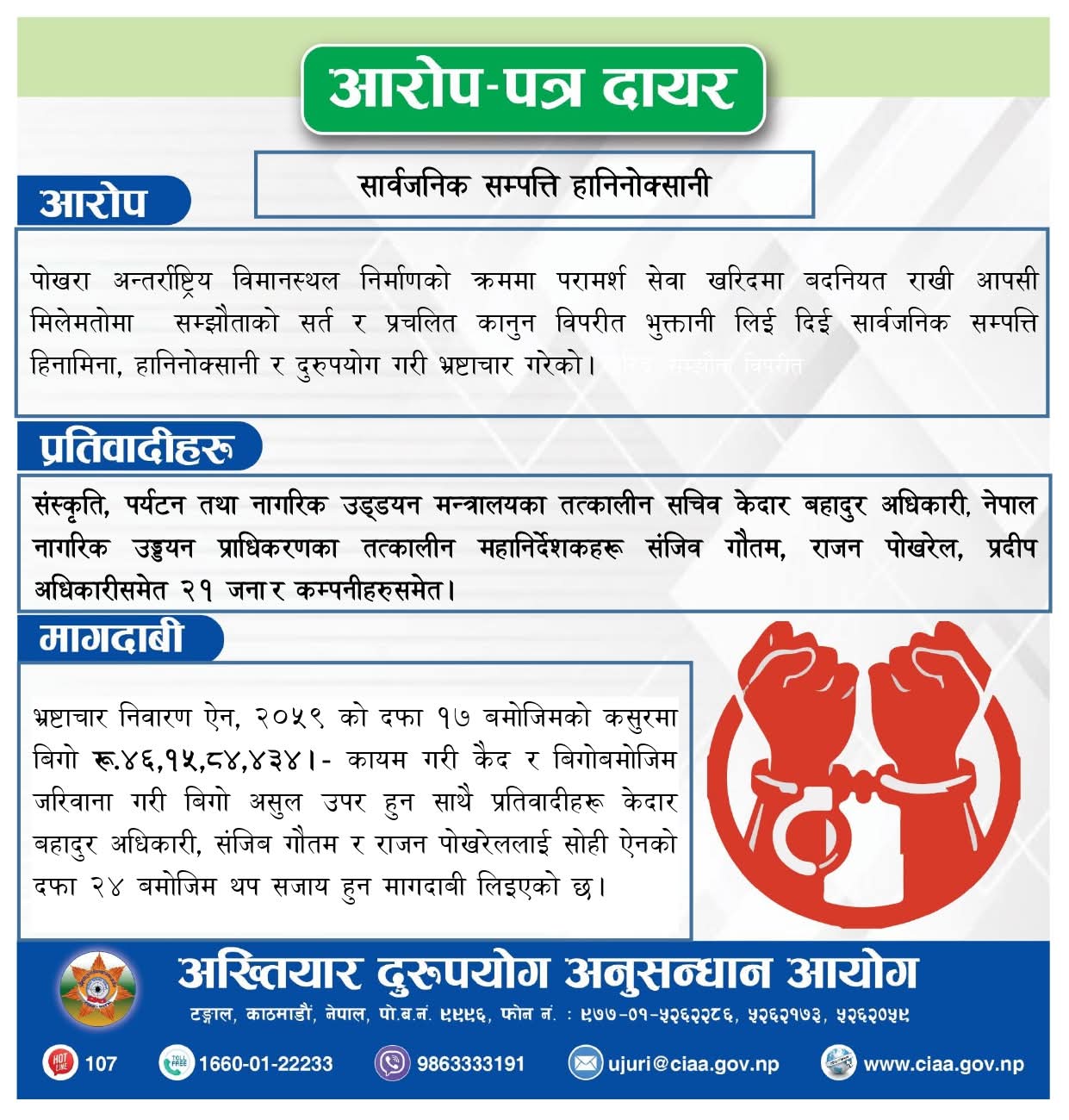पोखरा क्षेत्रीय अन्तर्राष्ट्रिय विमानस्थल निर्माणमा तत्कालीन पर्यटन सचिव अधिकारीसहित नागरिक उड्डयन प्राधिकरणका पूर्वमहानिर्देशकहरू सञ्जीव गौतम, राजन पोखरेल र प्रदीप अधिकारीलाई प्रतिवादी बनाइएको छ। नेपाल नागरिक उड्डयन प्राधिकरणद्वारा पोखरा क्षेत्रीय अन्तर्राष्ट्रिय विमानस्थल निर्माण आयोजनामा परामर्शदाता नियुक्ति गर्दा अधिकारी भ्रष्टाचारमा डामिएका हुन्।
