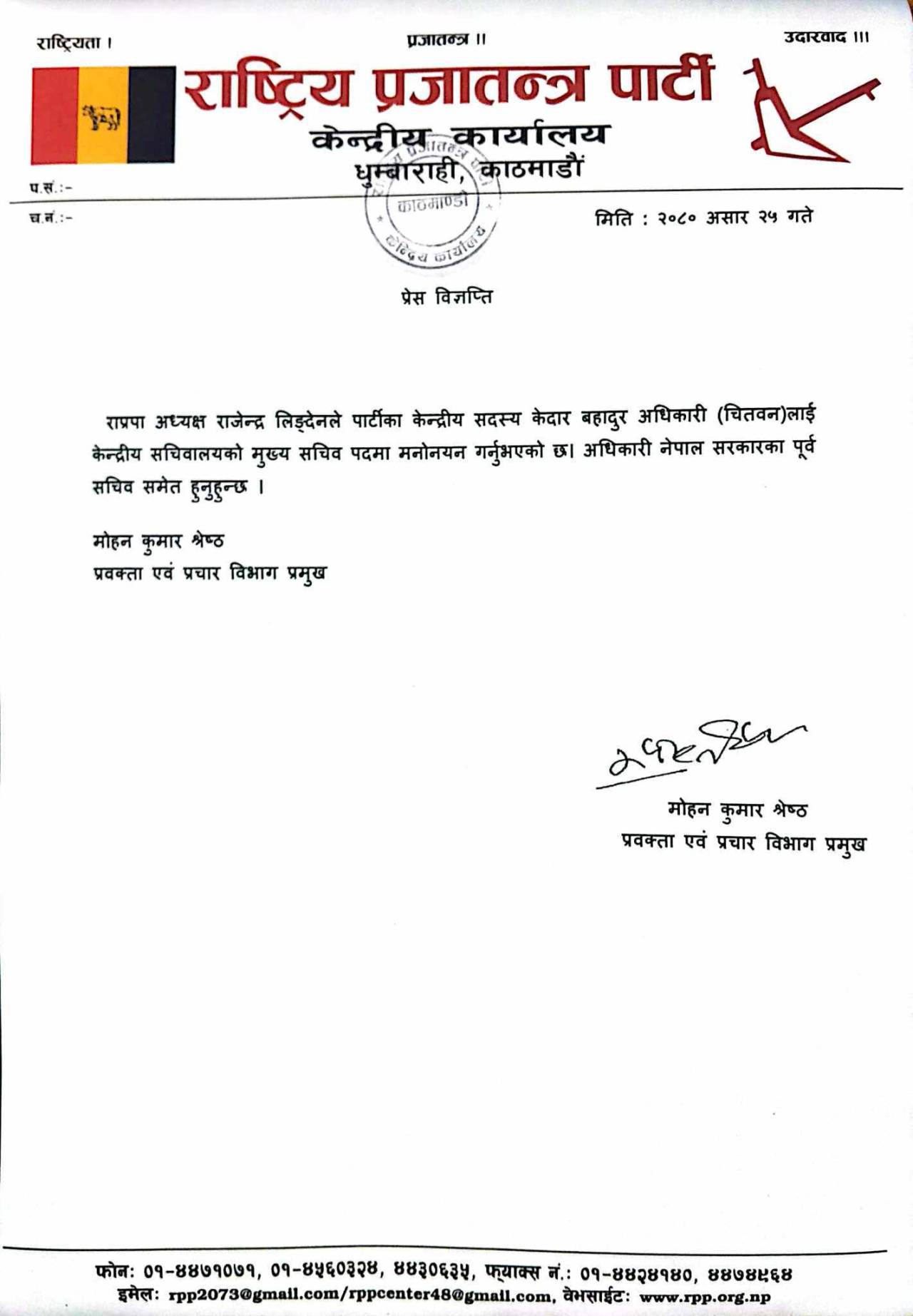 राप्रपाका मुख्यसचिव केदार बहादुर अधिकारीविरूद्ध भ्रष्टाचार मुद्दा