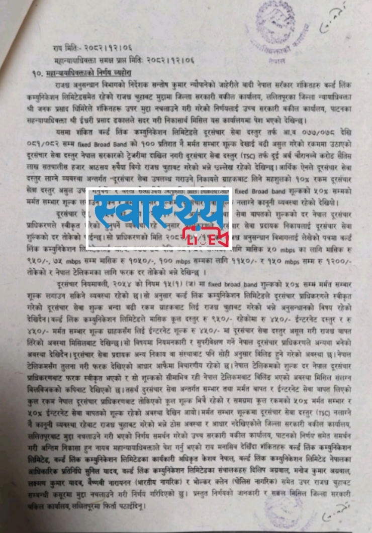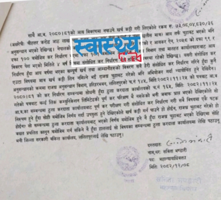 काठमाडौं। प्रधानमन्त्री सुशीला कार्कीको विश्वास पात्र महान्यायाधिवक्ता सबिता भण्डारीले वर्ल्डलिंकको सेटिङमा ७ अर्बको मुद्दा नचल्ने निर्णय गरेकी छिन्। राजस्व अनुसन्धान विभागको राय प्रतिवेदनलाई ‘डस्बिन’मा हालेर वर्ल्डलिंकले कर छली गरेको मुद्दा नचल्ने निर्णय गरेकी हुन्।