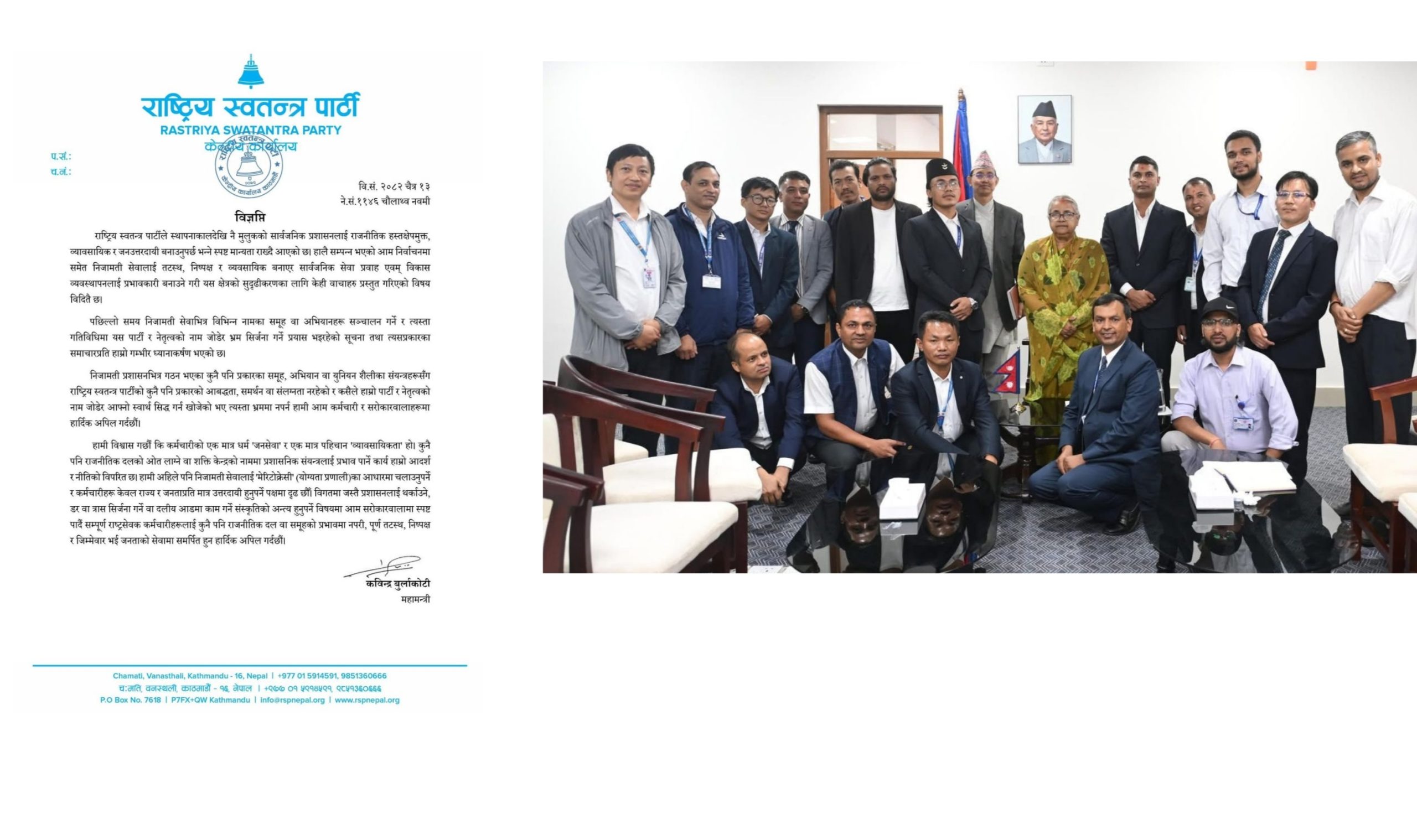 पार्टीका महामन्त्री कविन्द्र बुर्लाकोटी द्वारा जारी विज्ञप्तिमा निजामती सेवाभित्र विभिन्न नामका समूह वा अभियान सञ्चालन गर्दै पार्टी र नेतृत्वको नाम जोडेर भ्रम सिर्जना गर्ने प्रयास भइरहेको सूचना प्राप्त भएको उल्लेख गरिएको छ। यस्ता गतिविधिसँग पार्टीको कुनै पनि प्रकारको संलग्नता, समर्थन वा सम्बन्ध नरहेको स्पष्ट पारिएको छ।