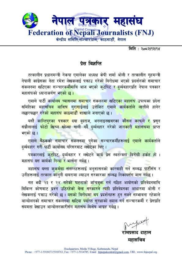 एमाले बैठकको समाचार संकलनमा पुगेका सञ्चारकर्मीहरूलाई एमाले कार्यकर्ताले दुर्व्यवहार गरी पार्टी कार्यालय परिसरबाट लखेटेका थिए । पत्रकारलाई कुटपिट, दुर्व्यवहार र लखेटने कार्य प्रेस स्वतन्त्रता विरोधी हर्कत हो । महासंघ यस कार्यको निन्दा र भत्र्सना गर्दछ ।