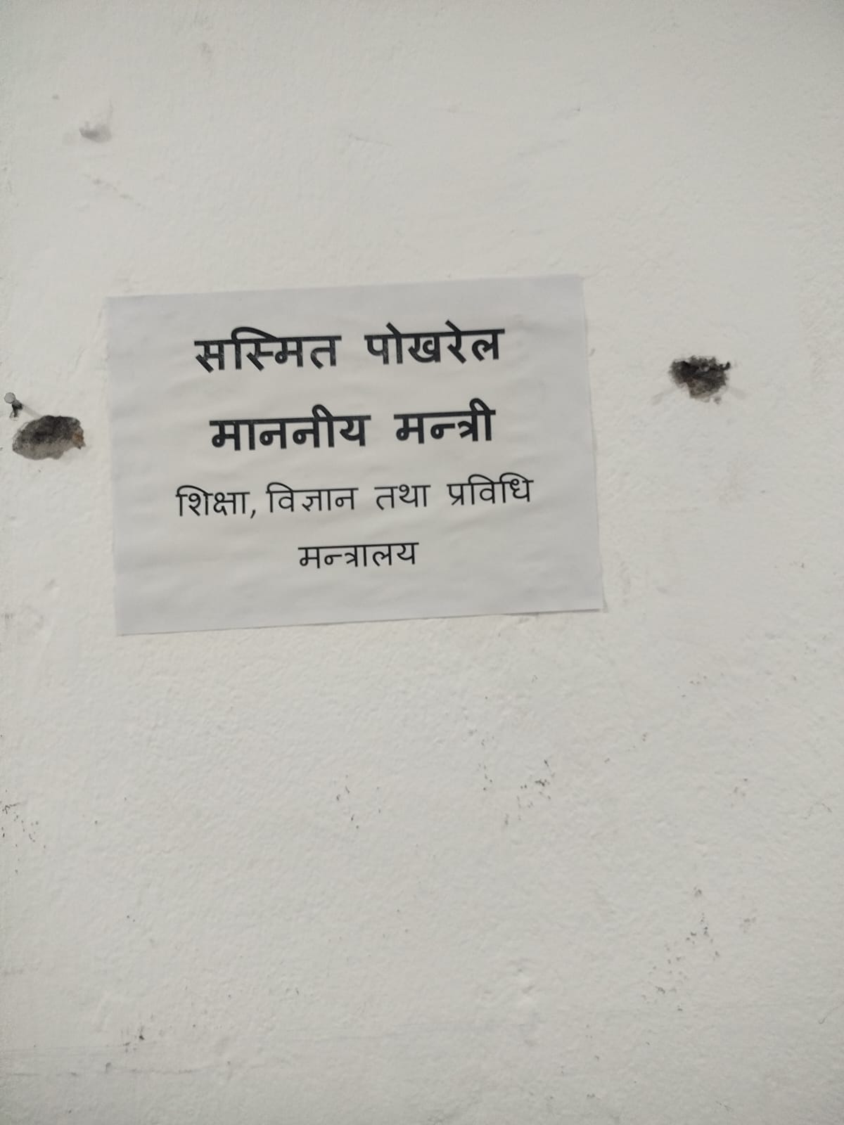 काठमाडौं। शिक्षा, विज्ञान तथा प्रविधि मन्त्रालयले मन्त्री सस्मित पोखरेलको ‘नेम-प्लेट’ समेत मन्त्रालयको प्रशासनले व्यवस्थापन गर्न सकेको छैन। सस्मितले उक्त मन्त्रालयको कार्यभार सम्हालेको ७२ घण्टा बित्दा समेत शिक्षामन्त्री पोखरेलको नाम र पद कागजमा लेखेर भित्तामा टाँसिएको छ। यसले शिक्षा मन्त्रालयको प्रशासनको व्यवस्थापन क्षमता उदांगिएको हो।
