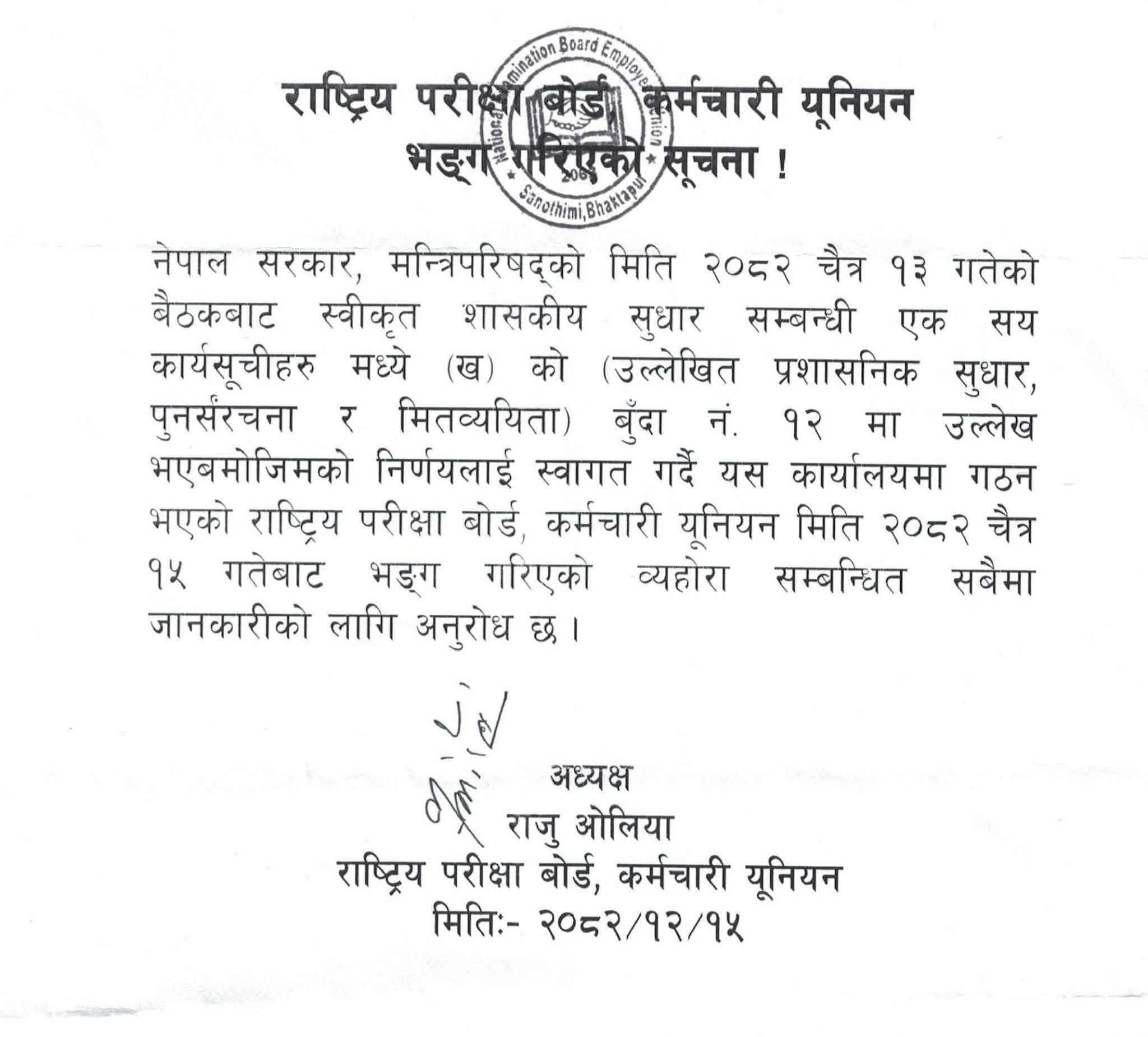 नेपाल सरकार, मन्त्रिपरिषद्को मिति २०८२ चैत्र १३ को बैठकबाट स्वीकृत शासकीय सुधार सम्बन्धी एक सय कार्यसूचीमध्ये (ख) को (उल्लेखित प्रशासनिक सुधार, पुनर्संरचना र मितव्ययिता) बुँदा नम्बर १२ मा उल्लेख भएबमोजिमको निर्णयलाई स्वागत गर्दै यस कार्यालयमा गठन भएको राष्ट्रिय परीक्षा बोर्ड, कर्मचारी युनियन मिति २०८२ चैत्र १५ गतेबाट भङ्ग गरिएको अध्यक्ष ओलियाले जानकारी दिएका छन्। उक्त १२ नम्बर बुँदामा ‘सार्वजनिक प्रशासनलाई पूर्णतः राजनीतिक हस्तक्षेपबाट मुक्त गर्दै निष्पक्ष, तटस्थ र नागरिकप्रति उत्तरदायी बनाउने । यस उद्देश्यका लागि निजामती कर्मचारी, शिक्षक, प्राध्यापक तथा सबै राष्ट्रसेवकले कुनै पनि दल, समूह वा स्वार्थ केन्द्रसँगको प्रत्यक्ष वा अप्रत्यक्ष आबद्धताबाट मुक्त भई कार्यसम्पादन गर्न अनिवार्य गर्ने र उल्लङ्घन भएमा प्रचलित कानुनबमोजिम कडाइका साथ विभागीय कारवाही गर्ने। साथै, सार्वजनिक प्रशासनमा दलीय ट्रेड युनियन खारेज गरी अवाञ्छित हस्तक्षेप र अनौपचारिक दबाबको अन्त्य गर्दै निर्णय प्रक्रिया तथा सेवा प्रवाहलाई प्रभावकारी बनाउने।’, उल्लेख छ। बालेन सरकारको दलीय कर्मचारी ट्रेड युनियन खारेज गर्ने अभियान राष्ट्रिय परीक्षा बोर्डबाट कार्यान्वयनमा आएको हो।