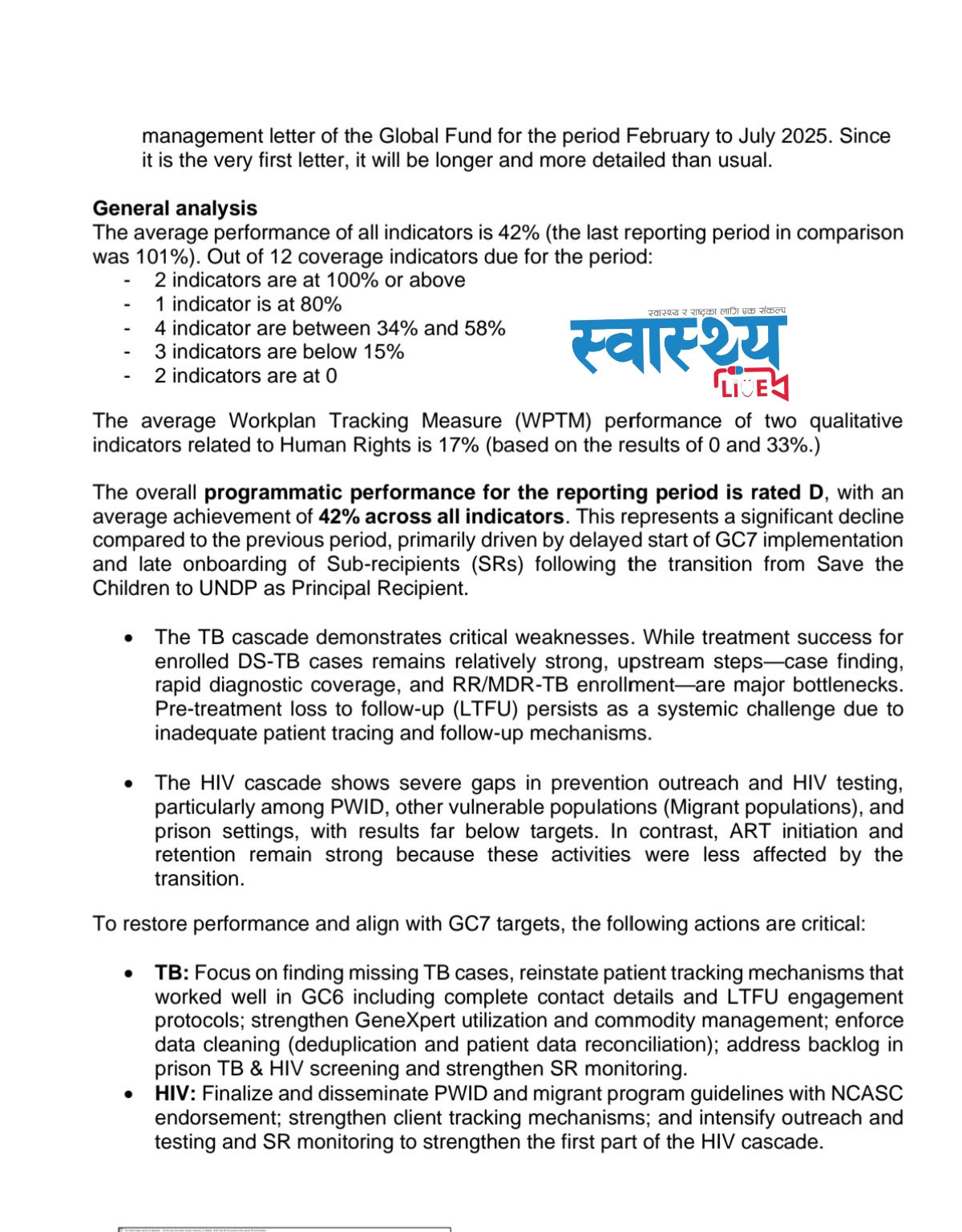 यसबीच, यूएनडिपीको कार्यसम्पादन पनि सन्तोषजनक देखिएको छैन। फेब्रुअरीदेखि जुलाई २०२५ सम्मको मूल्यांकनमा औसत उपलब्धि ४२ प्रतिशतमा सीमित रहँदै ‘डी (कमजोर)’ रेटिङ पाएको छ। एचआईभी परीक्षण लक्ष्यभन्दा कम हुनु, टीबी केस पहिचान कमजोर रहनु र एसआर व्यवस्थापन प्रभावकारी नहुनुले कार्यक्रमको नतिजा नै जोखिममा परेको देखिन्छ। त्यसमाथि खर्च क्षमता अत्यन्त न्यून रहनु र ट्याक्स/भ्याट चुहावट जारी रहनुले आर्थिक पक्षसमेत कमजोर बनेको छ।