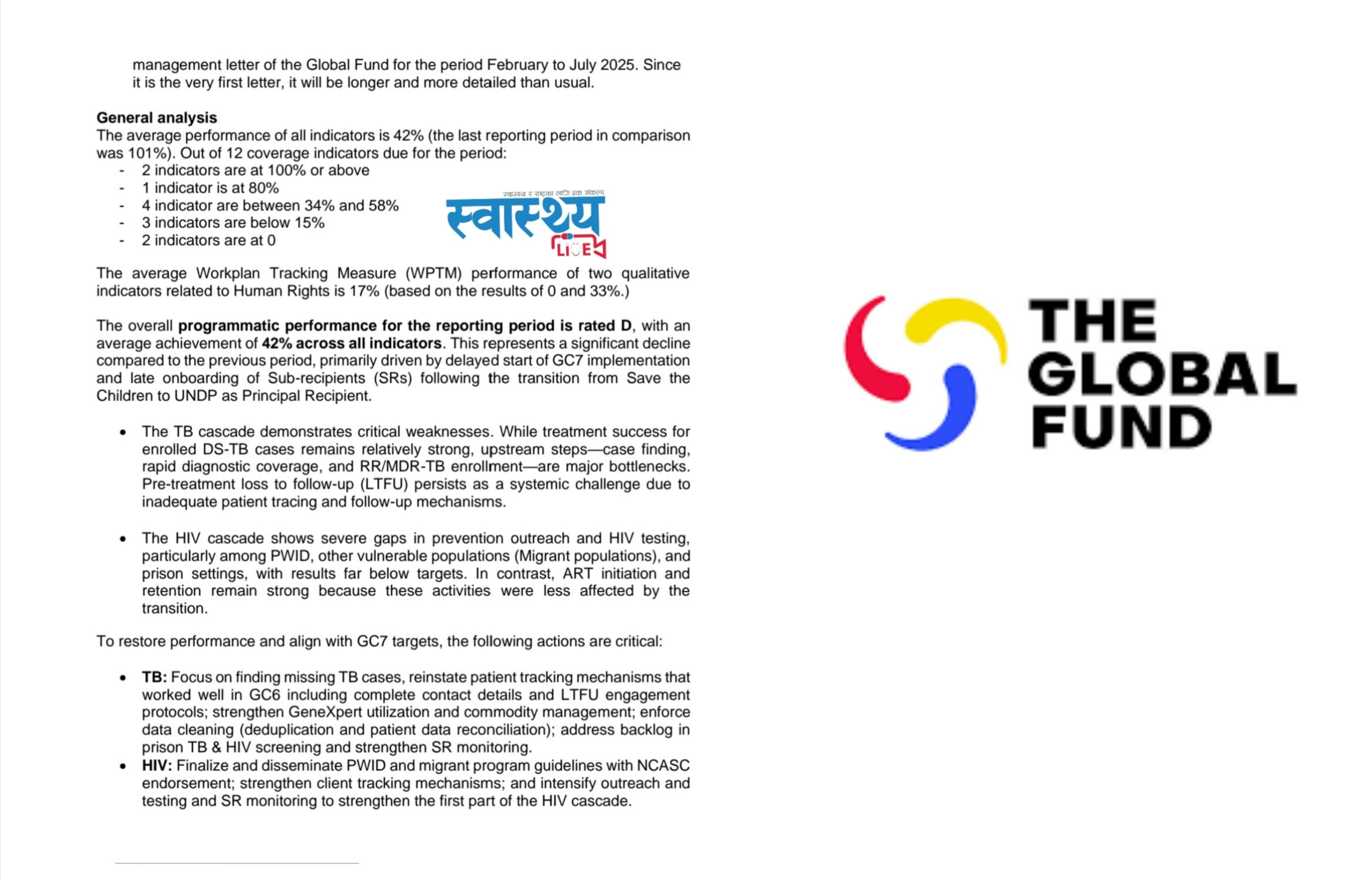 ग्रान्ट साइकल ७ (२०२४–२०२७) अन्तर्गत सञ्चालन भइरहेको कार्यक्रम अपेक्षाअनुसार अघि बढ्न सकेको छैन। कार्यक्रम अपराधीक पृष्ठभूमिका गजानन्द भण्डारीले नेतृत्व गरेका छन् । जसलाई केही वर्ष अगाडि सिआईबिले नक्कली डाक्टरमा पक्राउ गरेकाे थियाे । यस्ता व्यक्तिको नेतृत्वमा यूएनडिपीले ग्लाेबल फण्ड कार्यक्रम संचालन गर्दा उपलब्धि “डी” आएको छ । राज्यलाई आएको अनुदान विवादास्पद व्यक्तिको नेतृत्वमा संचालन हुँदा निराशाजनक उपलब्धि देखिएको छ, यसमा बालेन सरकारले आवश्यकता अनुसार एक्सन लिनुपर्छ । अधिकारीहरू भन्छन् सरकारलाई आएको अनुदान अपराधिक पृष्ठभूमिका व्यक्तिले सञ्चालन गरिरहेको छ, यसलाई संरक्षण गर्ने स्वास्थ्य सचिव र समन्वय महाशाखा प्रमुखलाई कारबाहीको दायरामा ल्याउनु पर्छ ।