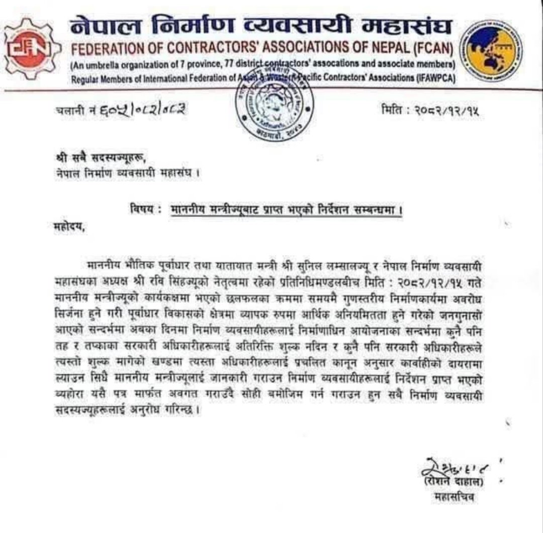 मन्त्री लम्सालबाट कुनै तह र तप्काका सरकारी अधिकारीहरूलाई कुनै अतिरिक्त शुल्क नदिन र कुनै पनि सरकारी अधिकारीहरूले त्यस्तो शुल्क मागेको खण्डमा त्यस्ता अधिकारीहरूलाई प्रचलित कानुन अनुसार कारबाहीको दायरामा ल्याउन सीधै मन्त्रीलाई जानकारी गराउन निर्माण व्यवसायीलाई निर्देशन प्राप्त भएको नेपाल निर्माण व्यवसायी महासंघकाले खुलासा गरेको छ। निवर्तमान सहरी विकास मन्त्री कुमार इङनामले २ देखि ५ प्रतिशत कमिसनको खेल रहेको तथ्य सार्वजनिक गरिदिएका थिए। उक्त विषयमा सहरी विकास मन्त्रालय सचिव गोपालप्रसाद सिग्देल र सहरी विकास तथा भवन विभागका महानिर्देशक रविन्द्र बोहरा मुछिएका थिए। भौतिक पूर्वाधार तथा यातायात र सहरी विकासमन्त्री सुनिल लम्सालले घूस(कमिसन) माग्ने कर्मचारीको विषयमा जानकारी गराउन निर्माण व्यवसायीहरूलाई निर्देशन दिएका हुन्। उक्त निर्देशनसँगे कमिसनखोर कर्मचारीहरूको निद हराम भएको छ।