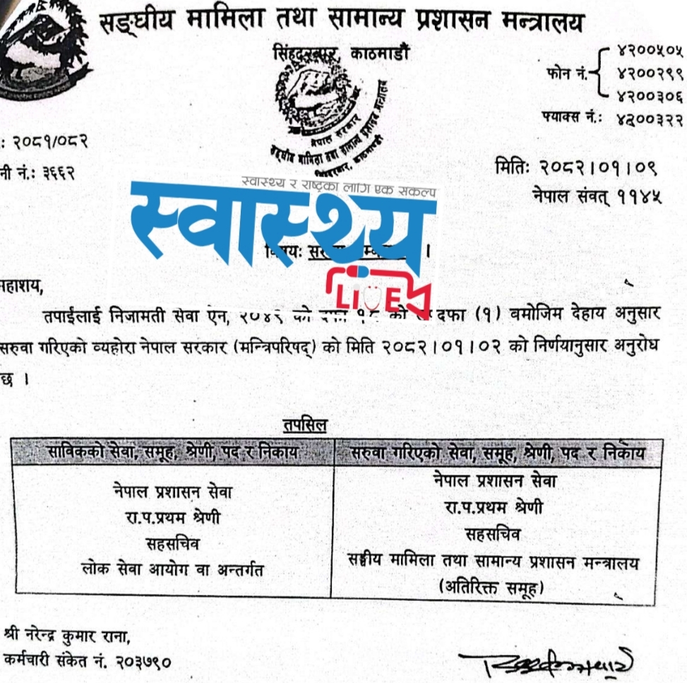 सहसचिव रानाको लोक सेवा आयोगबाट २०८२ साल बैशाख २ गते संघीय मामिला तथा सामान्य प्रशासन मन्त्रालयको अतिरिक्त समूहमा सरूवा भएको देखिन्छ। त्यसको एक महिना बितेपछि लोक सेवा आयोगको जलेश्वर कार्यालयबाट राना २०८२ जेठ ८ गते रमाना भएको सूचना स्वास्थ्य लाइभलाई प्राप्त भएको छ। राना अहिलेसम्म संघीय मामिला तथा सामान्य प्रशासन मन्त्रालयमा हाजिर भएको रेकर्डबाट देखिँदैन। मन्त्रालयले उनलाई तलब समेत खुवाएको पाइँदैन। नेपाल सरकारको राजपत्राङ्कित प्रथम श्रेणी(सहसचिव) १० महिनादेखि बेपत्ता हुँदा पनि सरकार वेखबर देखिएको हो।