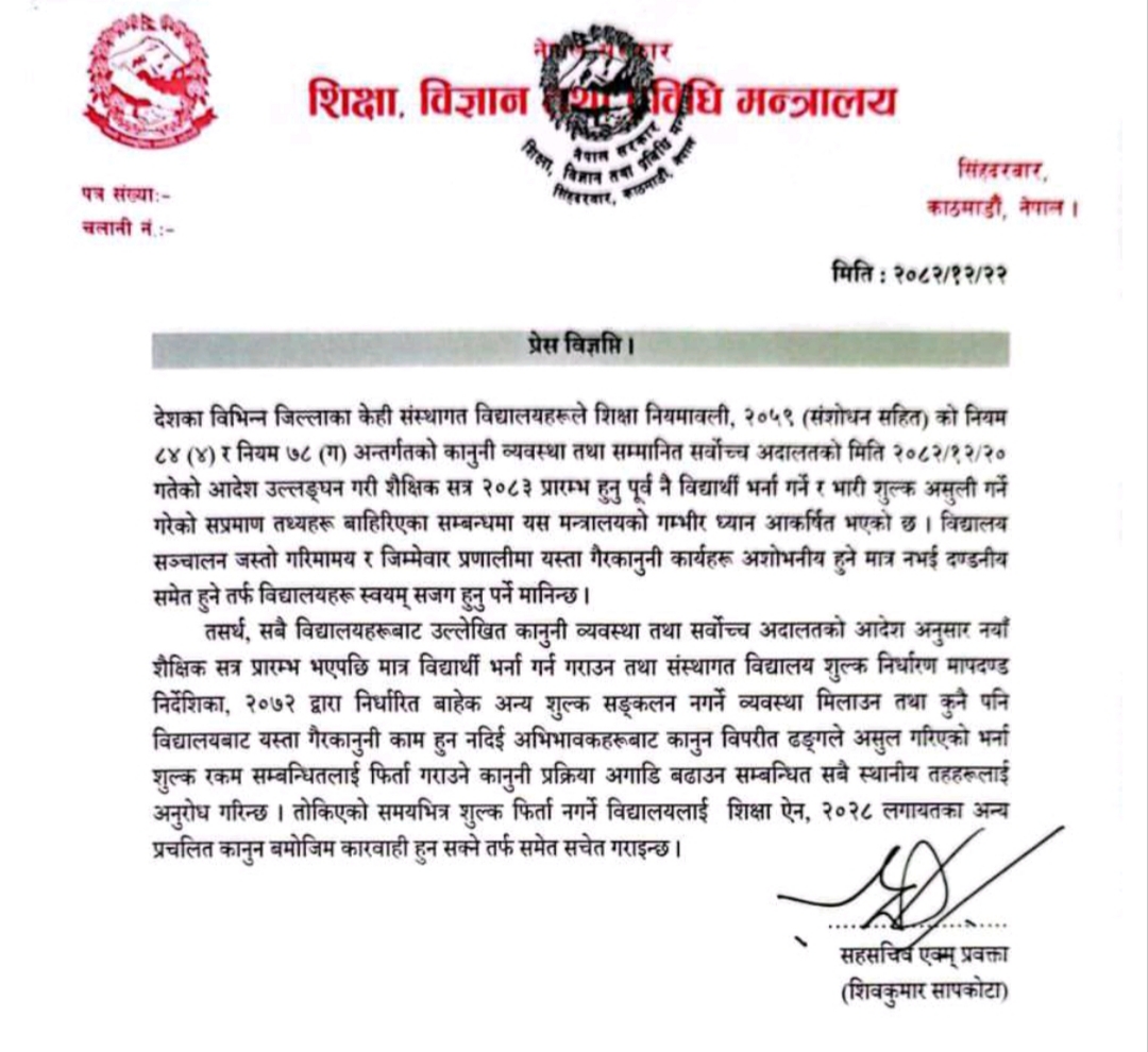 ‘देशका विभिन्न जिल्लाका केही संस्थागत विद्यालयहरुले शिक्षा विनियमावली, अन्तर्गतको कानुनी व्यवस्था तथा सम्मानित सर्वोच्च अदालतको यही चैत २० गतेको आदेश उल्लङ्घन गरी शैक्षिक सत्र २०८३ प्रारम्भ हुनु पूर्व नै विद्यार्थी भर्ना गर्ने र भारी शुल्क असुली गर्ने गरेको सप्रमाण तथ्यहरु बाहिरिएका सम्बन्धमा यस मन्त्रालयको गम्भीर ध्यान आकर्षित भएको छ ।’ विज्ञप्तिमा भनिएको छ ।
