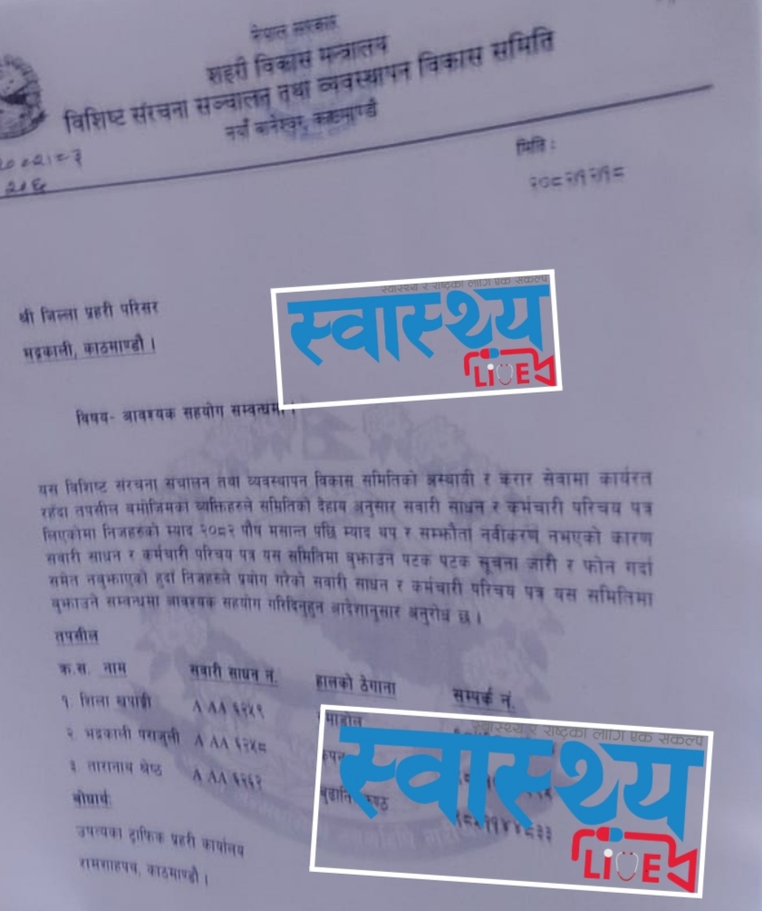 त्यस्तै एमाले नेता एवं खोटाङका पूर्वसांसद विशाल भट्टराईको ‘ड्राइभर’ हुँदै केन्द्रमा करारको जागिर खाएका तारानाथ श्रेष्ठले पनि सरकारी सवारी लिएर हिँडेका छन्। उनले प्रयोग गर्ने ६२६२ नम्बरको मोटरसाइकल पनि समितिले प्रहरी लगाएर फिर्ता ल्याउने प्रयास गरेको छ। शिला खपाङ्गीले भने प्रहरी लगाएपछि सवारी साधन फिर्ता गरेको समितिका कर्मचारीहरूले जानकारी दिए।