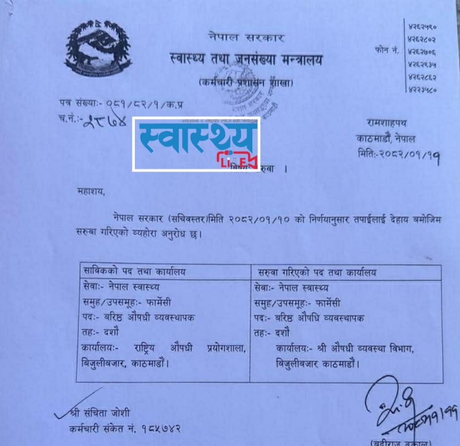 नेपाल स्वास्थ्य सेवा फार्मेसी समूहको वरिष्ठ औषधि व्यवस्थापक दशौं तहकी जोशी सचिवस्तरीय निर्णयबाट २०८२ बैशाख १० गते सरूवा भएकी थिइन्। राष्ट्रिय औषधि प्रयोगशालाबाट उनको सरूवा औषधि व्यवस्था विभाग भएको देखिन्छ। तर, जोशी एक वर्षसम्म पनि प्रयोगशालाबाट विभाग पुगेकी छैनन्।