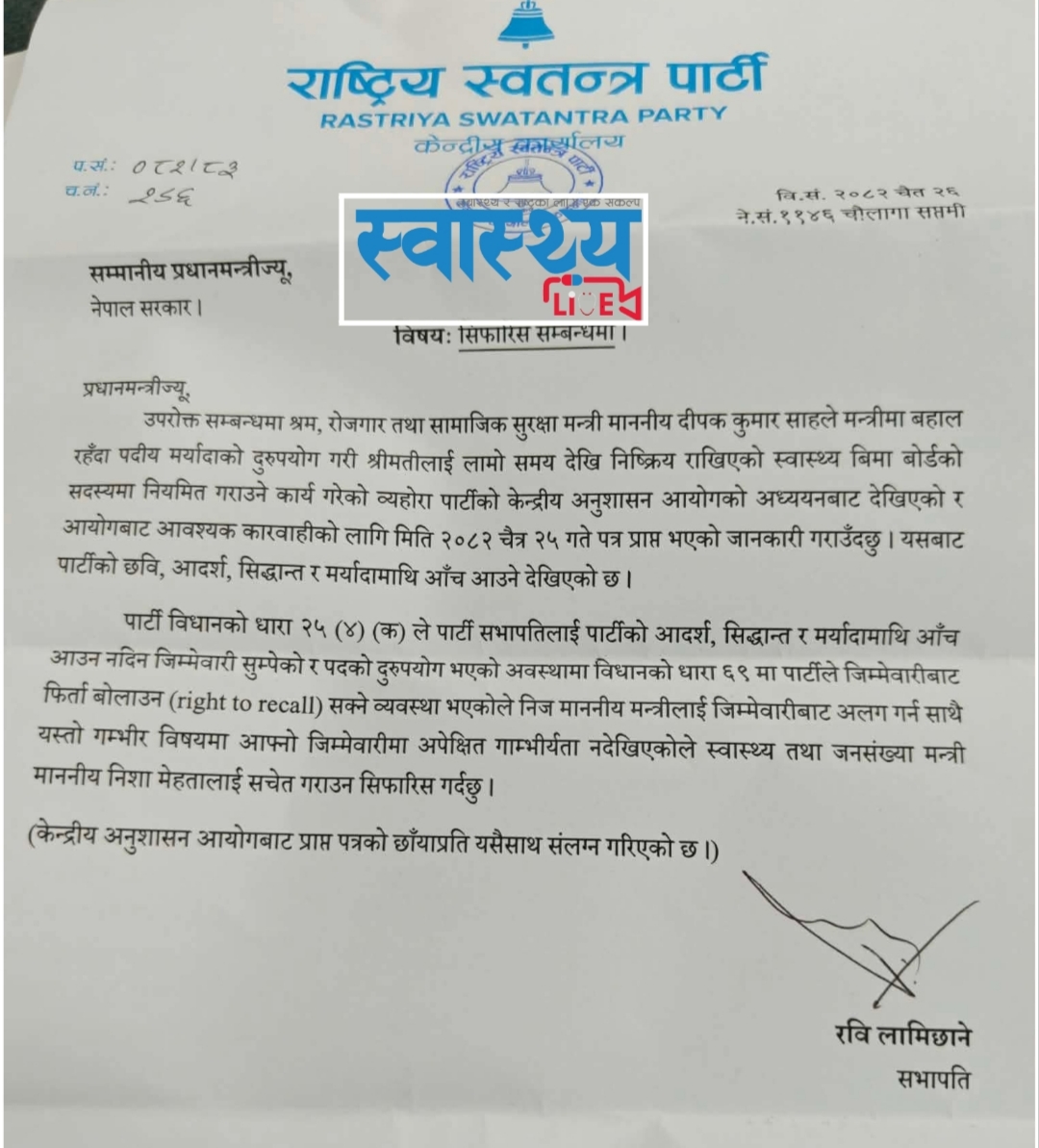 राष्ट्रिय स्वतन्त्र पार्टीका सभापति रवि लामिछानेको सिफारिसमा प्रधानमन्त्री बालेनले श्रममन्त्री साहलाई बर्खास्त गरेका हुन्। श्रममन्त्री साहले पदीय मर्यादाको दुरूपयोग गरी श्रीमतीलाई लामो समयदेखि निष्क्रिय स्वास्थ्य बीमा बोर्डको सदस्यमा नियमित गराउने कार्य गरेको व्यहोरा पार्टी केन्द्रीय अनुसन्धान आयोगको अध्ययनबाट देखिएको भन्दै सभापति लामिछानेले जिम्मेवारीबाट हटाउन सिफारिस गरेका थिए। पार्टीको सिफारिससँगै प्रधानमन्त्री बालेनले श्रममन्त्री साहलाई बर्खास्त गरेका हुन्। त्यस्तै स्वास्थ्य मन्त्री निशा मेहतालाई समेत सचेत गराउने पार्टीले सिफारिस गरेको छ।