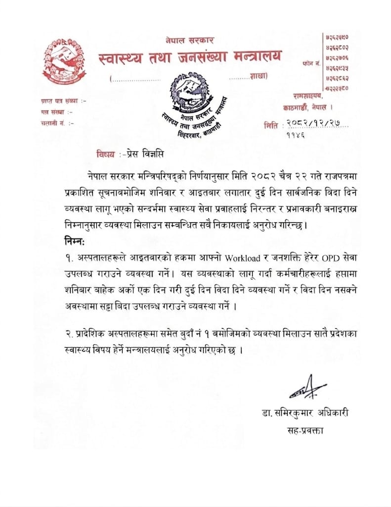 मन्त्रालयले शुक्रबार प्रेस विज्ञप्ति जारी गर्दै अस्पतालहरूमा स्वास्थ्य सेवा निरन्तर र प्रभावकारी रूपमा सञ्चालन गर्न आइतबार पनि OPD सेवा सञ्चालन गर्ने व्यवस्था मिलाउन निर्देशन दिएको हो।