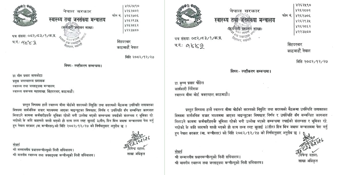 स्वास्थ्य बीमा बोर्डको सदस्य नियुक्ति, बैठकमा उपस्थितिलगायत विषयमा सञ्चारमाध्यममा आएका विवरणका आधारमा मन्त्रालयले तीन दिनभित्र जवाफ दिन निर्देशन दिएको हो। माइन्युट, निर्णय प्रक्रिया र कागजात मिलाउने काममा कर्मचारीकै संलग्नता रहेको विषय सार्वजनिक भएपछि मन्त्रालय सक्रिय बनेको हो।