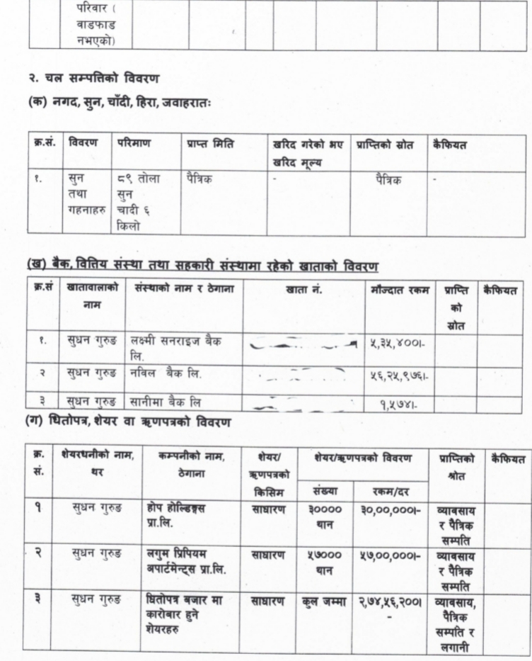 गृहमन्त्री गुरूङका बाजे रामसलको नाममा सगोलमै गोरखमा २२१ रोपनी जग्गा रहेको र उनका पिता दिलबहादुर गुरूङको भरतपुर चितवनमा ३० कट्ठा र गृहमन्त्री गुरूङको धनकुटामा १९ रोपनी १५ आना (झन्डै २० रोपनी) जग्गा रहेको पाइन्छ। गोरखा र चितवनको पैतृक सम्पत्ति रहेको भन्ने उल्लेख छ भने धनकुटामा लगानीबाट प्राप्त भएको जनाइएको छ।