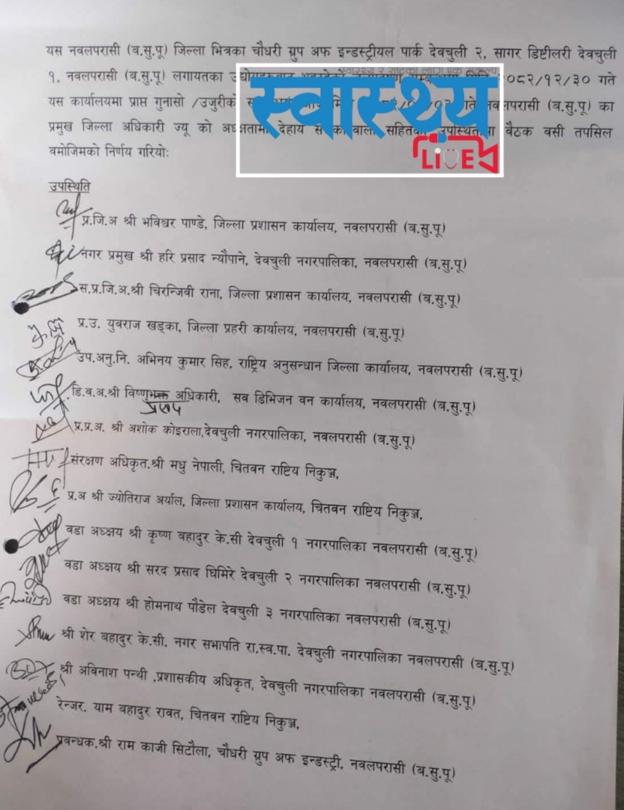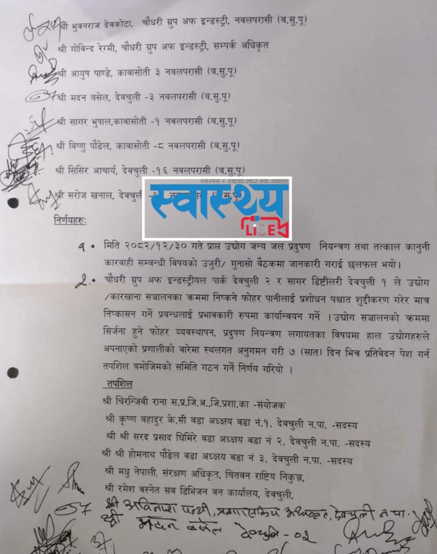 सिडिओको अध्यक्षतामा बसेको बैठकले चौधरी ग्रुप अफ इन्डस्ट्रियल पार्क देवचुली-२ र सागर डिस्टिलरी देवचुली-१ ले उद्योग/कलकारखाना सञ्चालनका क्रममा निष्कने फोहोर पानीलाई प्रशोधन पश्चात सुद्धीकरण गरेर मात्र निष्कासन गर्ने प्रबन्धलाई प्रभावकारी रूपमा कार्यान्वयन गर्ने निर्णय गरेको छ। देवचुली नगरपालिकाका मेयर हरिप्रसाद न्यौपाने, जिल्ला प्रहरी कार्यालयका प्रमुख प्रहरी उपरीक्षक युवराज खड्का, प्रमुख प्रशासकीय अधिकृतलगायतको उपस्थितिमा बसेको बैठकले समिति नै गठन गरेर सिजी पार्कमाथि एक्सन लिने प्रक्रिया अघि बढाएको हो।