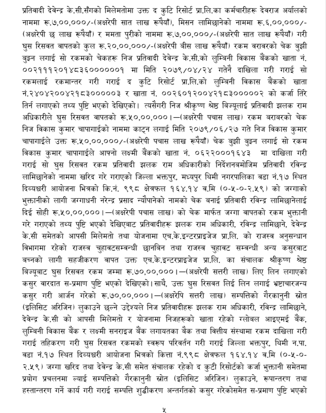 अख्तियारले विशेष अदालतमा दायर गरेको अभियोगपत्र अनुसार झलकराम अधिकारीले घुस रिसवत बापतको चेक मार्फत लिएको ५० लाख रकम बैना वापत जग्गाधनी शाखा अधिकृत न्यौपानेले बुझेको देखिन्छ। सहसचिव अधिकारी कै निर्देशनमा रवीन्द्र लामिछानेको नाममा भक्तपुरको मध्यपुर थिमि नगरपालिकास्थित दिव्यश्वरी आयोजनाभित्र खरिद गरिएको कित्ता नम्बर ९९८ को ५ आना २ दाम बढी जग्गा शाखा अधिकृत न्यौपानेले बेचेका हुन्। दिव्यश्वरीको करोडौं मूल्यका जग्गाधनी शाखा अधिकृत न्यौपानेको विषयमा अख्तियार मौन देखिन्छ।