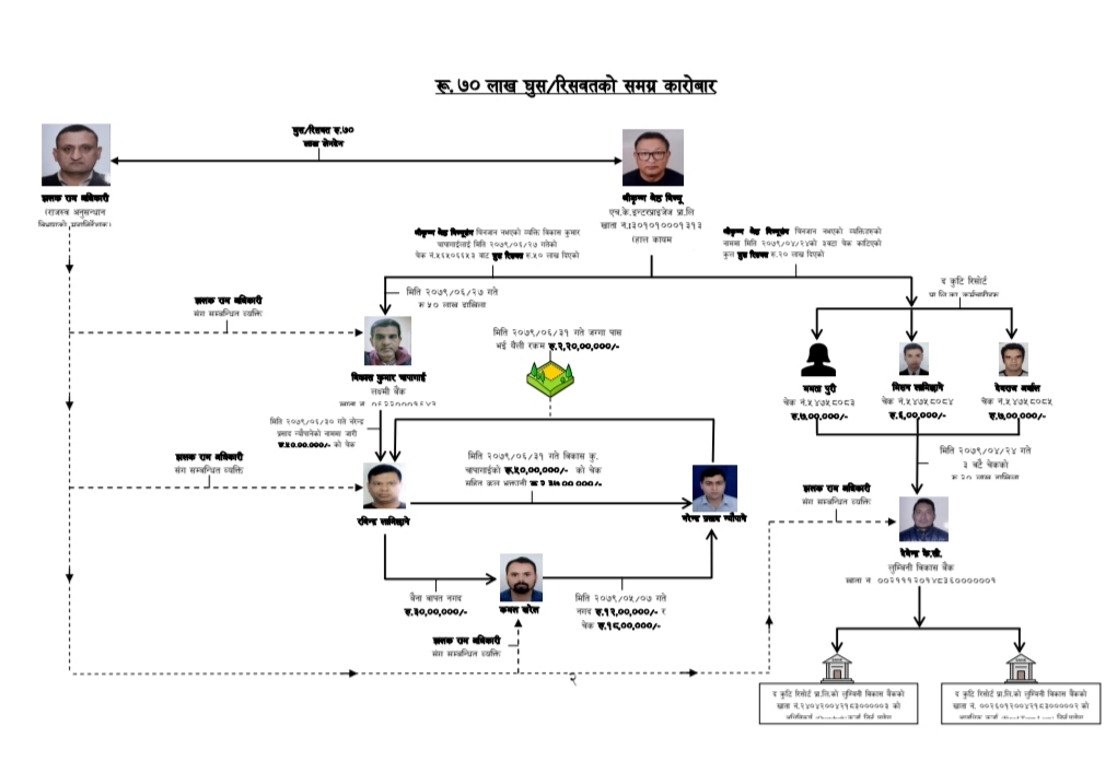 अख्तियारले घुस रकम व्यवस्थापन गर्न जग्गा लामिछानेको नाममा जग्गा किन्ने सहसचिव झलकरामलाई भ्रष्टाचार मुद्दा दायर गरेको छ। उनी हाल निलम्बनमा रहेका छन्। तर, उक्त जग्गा बेच्ने जग्गाधनी शाखा अधिकृत न्यौपाने फुक्काफाल देखिन्छन्।