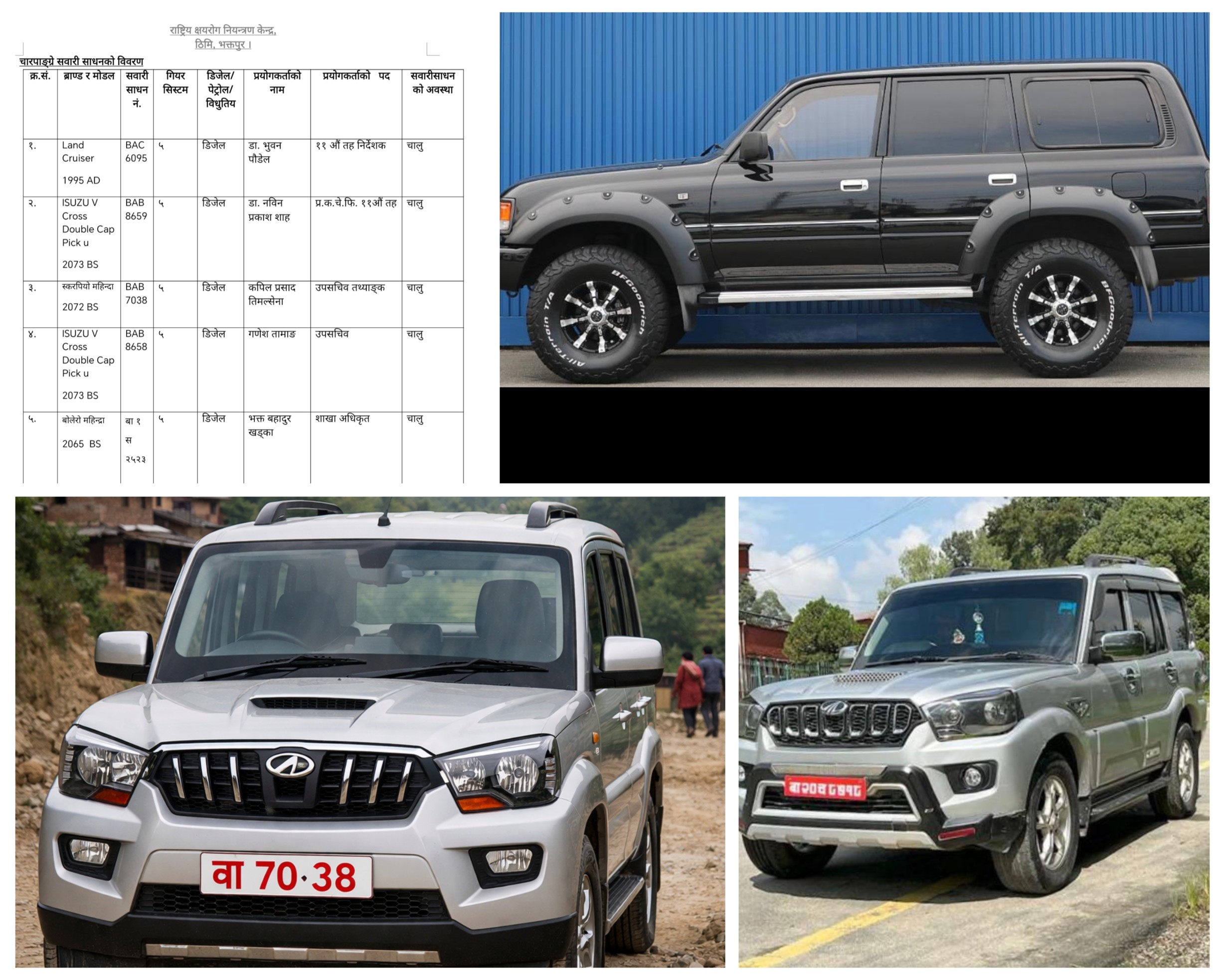 त्यस्तै उपसचिव गणेश तामाङले बा ८६५८ नम्बरको २०७३ मोडलको सुजुकी क्रस डबल क्याप गाडी प्रयोग गरिरहेका छन्। शाखा अधिकृत भक्तबहादुर खड्काले २०६५ मोडलको बा १ स २५२३ नम्बरको महिन्द्रा बोलेरो प्रयोग गर्दै आएका छन् भने लेखा अधिकृत सुस्मिता शर्माले २०६० मोडलको बा ८६५७ नम्बरको टोयोटा ल्याण्ड क्रुजर प्रयोग गर्दै आएकी छन्।