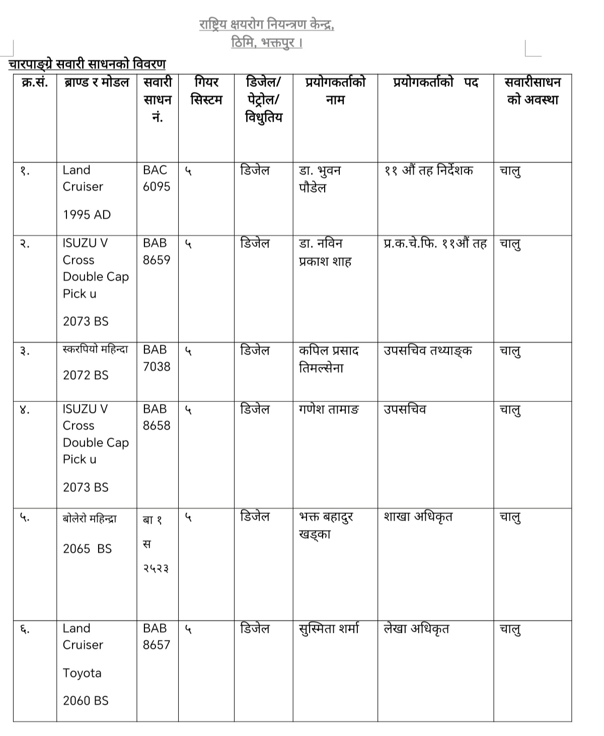 राष्ट्रिय क्षयरोग केन्द्रमा १७ गाडीको दुरुपयोग: लेखा अधिकृतलाई ल्याण्ड क्रुजर टोयटा, कार्यालय सहयोगी सबैलाई मोटरसाइकल