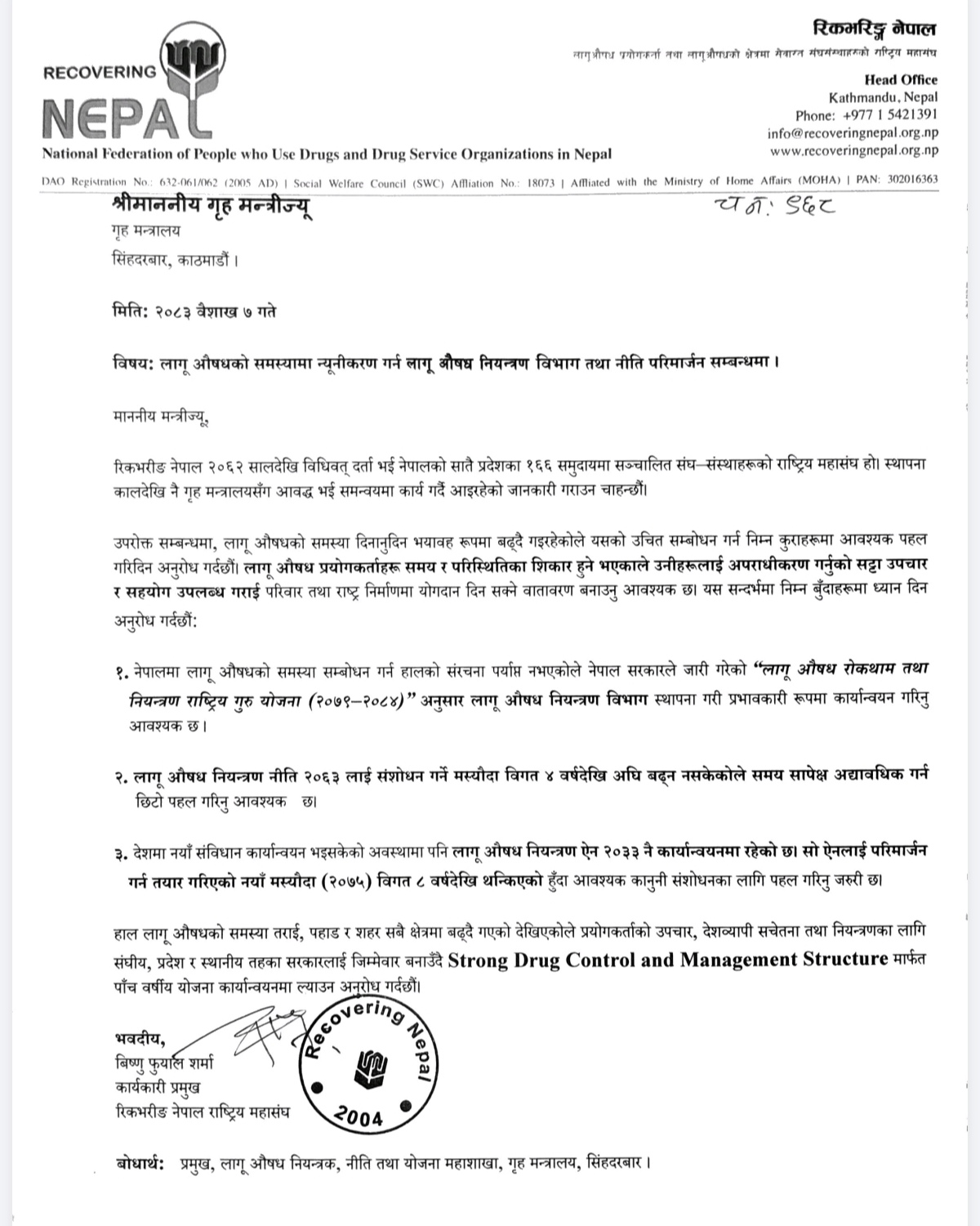 लागू औषध प्रयोगकर्ता तथा सेवा प्रदायक संस्थाहरूको राष्ट्रिय सञ्जाल ‘रिकभरिङ नेपाल’ले गृह मन्त्रालयलाई पत्र लेख्दै हालको संरचना पर्याप्त नभएको उल्लेख गर्दै विभाग गठन गरी प्रभावकारी कार्यान्वयन गर्न आग्रह गरेको हो।